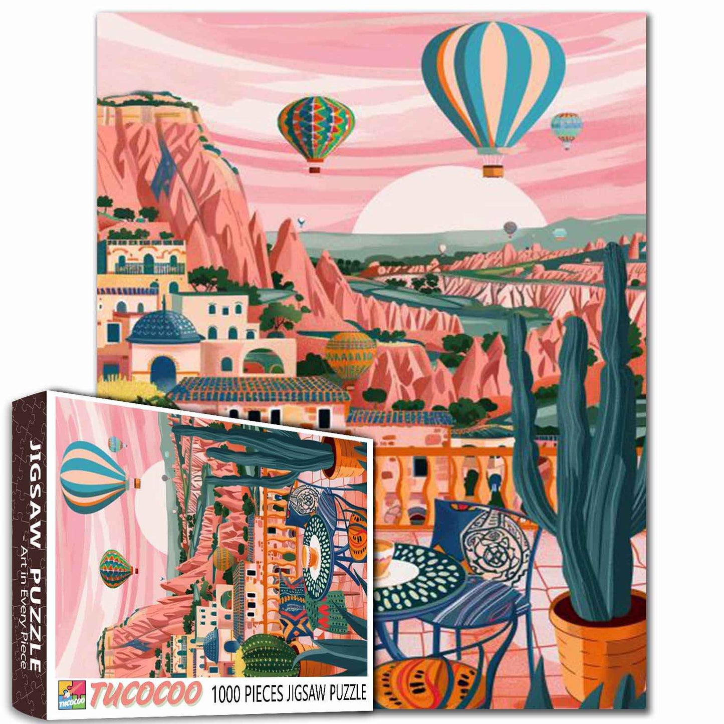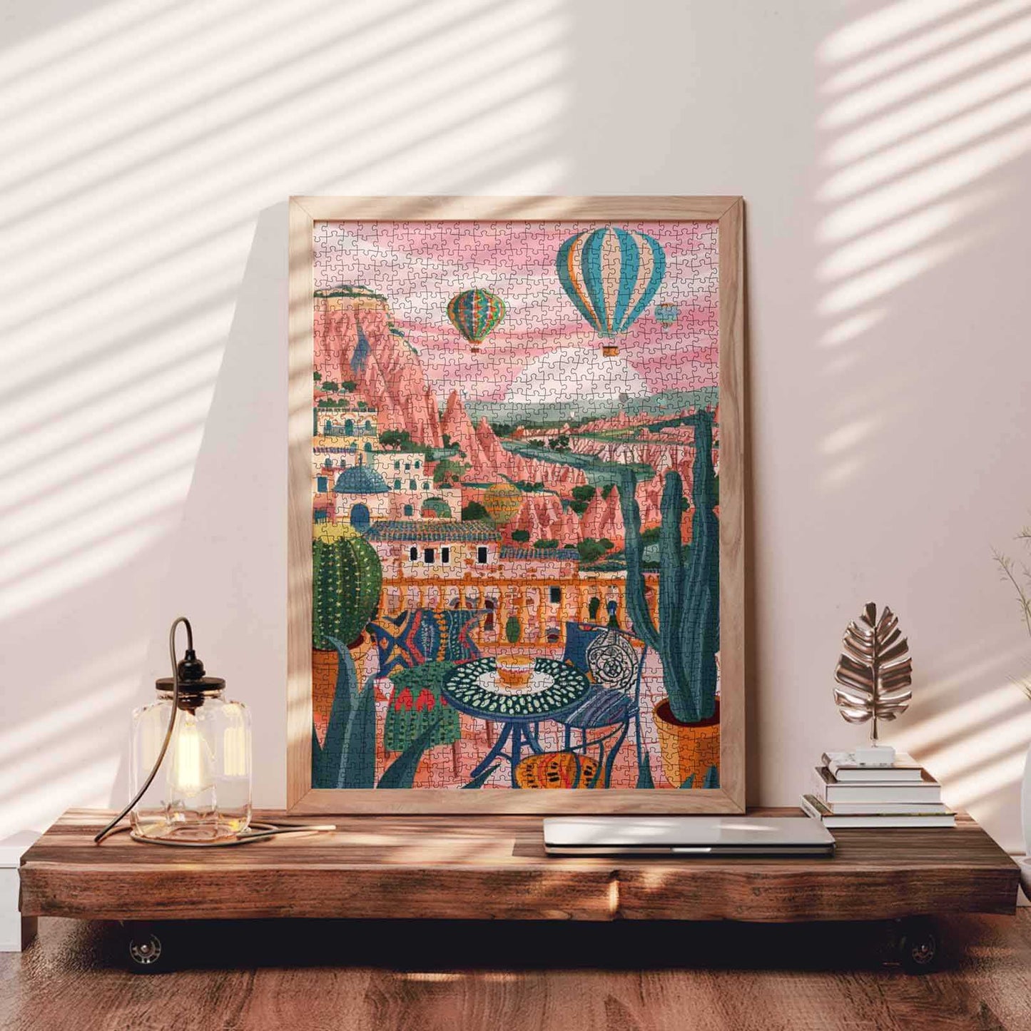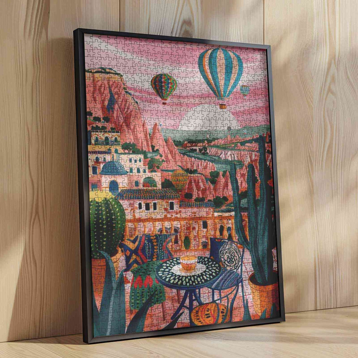 Genießen Sie Tee auf einer gemütlichen Terrasse, während bunte Heißluftballons über einen verträumten rosa Himmel über Terrakotta-Felsen und gewölbten Dächern schweben. Dieses Puzzle fängt den skurrilen Charme einer sonnigen Bergstadt ein, in der Kakteen blühen und Kissen in mediterranen Farben leuchten. Der weitläufige Talblick ist mit Freude und Licht gemalt und lädt Sie zu einem perfekten Moment der Entspannung und des Staunens ein. Lassen Sie sich von jedem Teil auf eine friedliche Reise durch Fantasie, Kultur und Sonnenschein entführen.