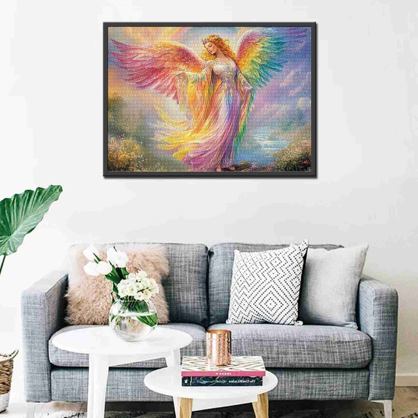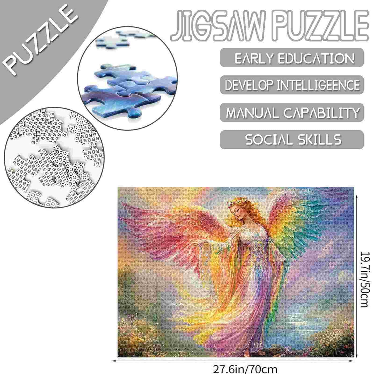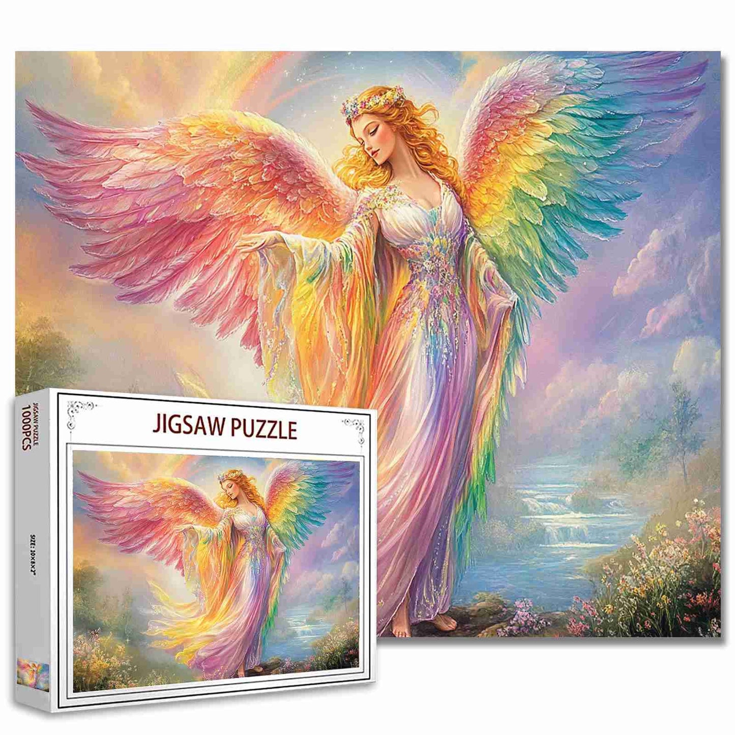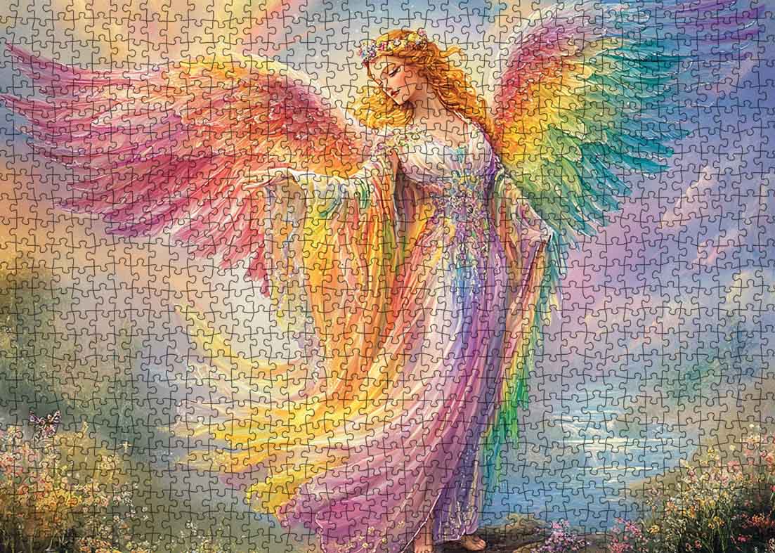 Ein anmutiger Engel steht auf einem nebligen Hügel, ihr wallendes Gewand verschmilzt mit den Farben der Morgendämmerung. Mit ausgebreiteten Flügeln in strahlenden Farben – feuriges Rot, zartes Rosa, sonniges Gelb, leuchtendes Grün und tiefes Blau – scheint sie den Himmel selbst zu umarmen. Ihr goldenes Haar leuchtet im Morgenlicht, und eine Blütenkrone ruht sanft auf ihrem Haupt. Die gesamte Szene wirkt wie eine Vision von Hoffnung und Frieden, gemalt in der Palette der Träume. Das Zusammensetzen dieses Puzzles ist eine Reise in einen Moment der Gelassenheit, in dem Farben singen und der Geist schwebt.
