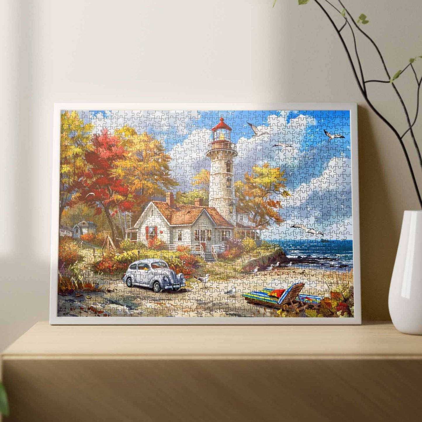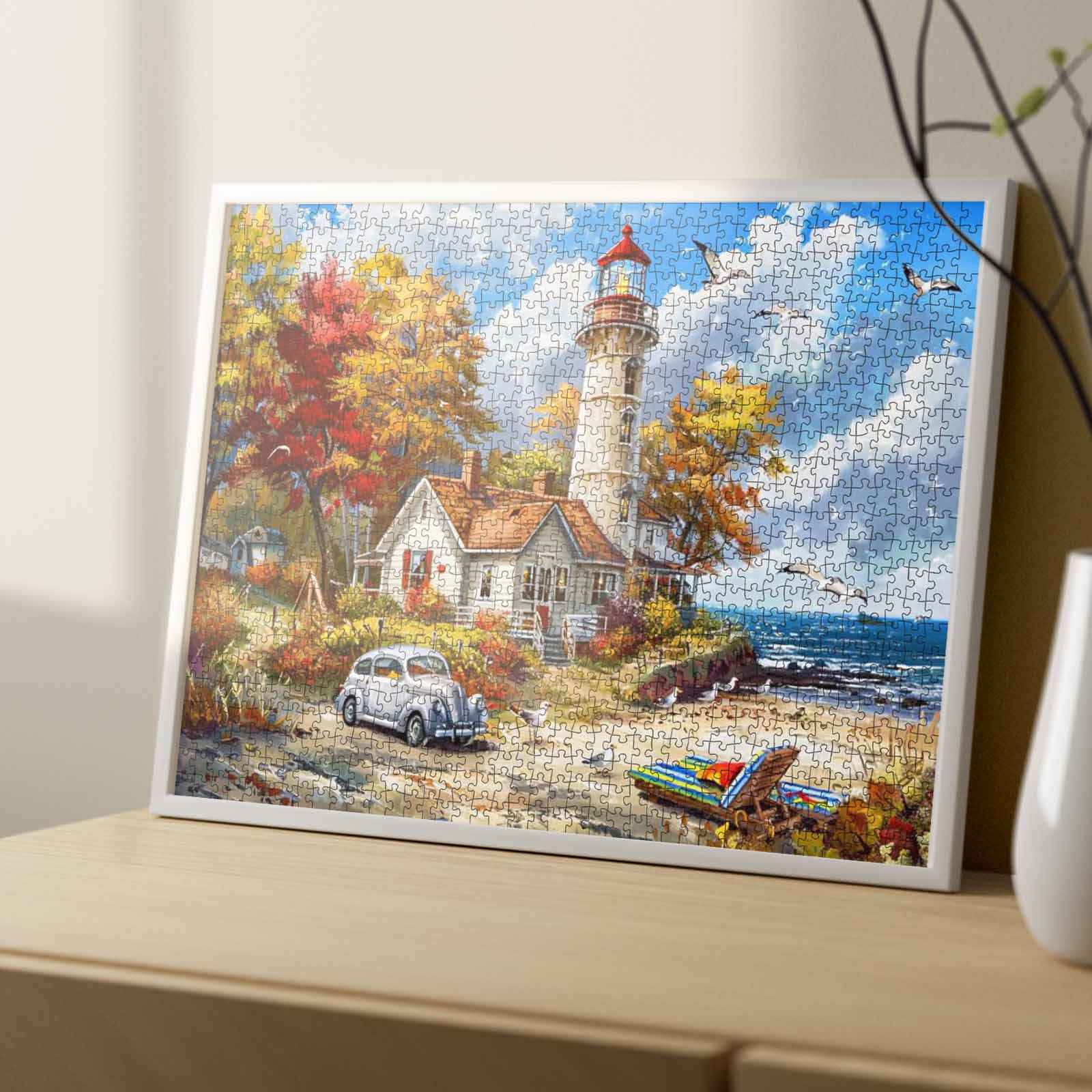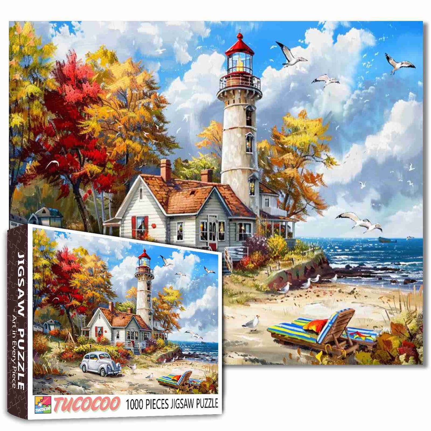 Goldene Blätter tanzen in der frischen Küstenbrise, während ein stattlicher Leuchtturm über die sanften Wellen wacht. Daneben schmiegt sich ein gemütliches Cottage, dessen Fenster heimelig strahlen. Ein Oldtimer steht ruhig auf der Sandstraße, während ein gestreifter Strandstuhl und ein Kajak entspannte Nachmittage am Meer ankündigen. Möwen kreisen am Himmel und runden diesen ruhigen Herbsturlaub am Meer ab. Dieses Puzzle fängt den Charme des Küstenlebens im Herbst ein – friedlich, farbenfroh und erfüllt von zeitloser Nostalgie.