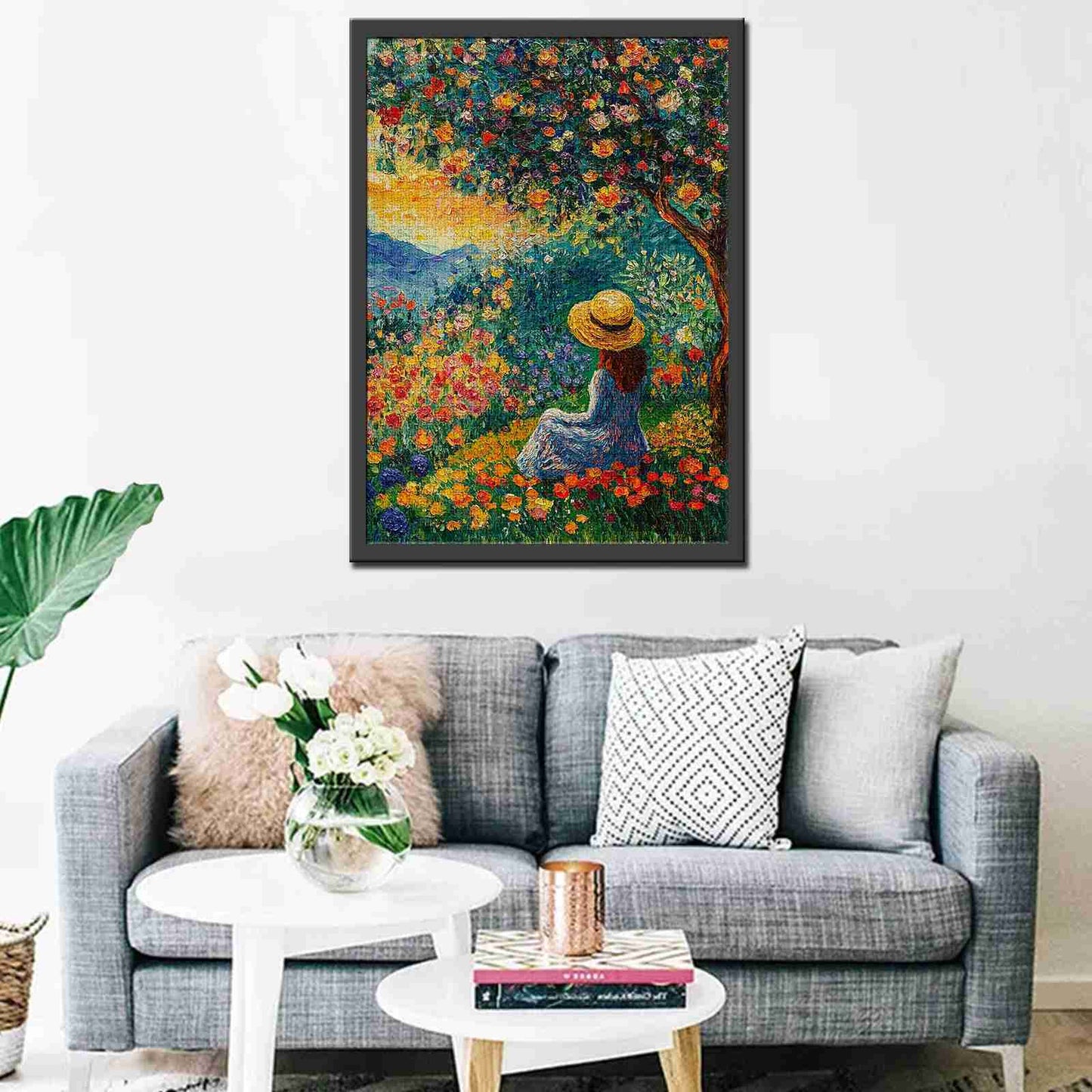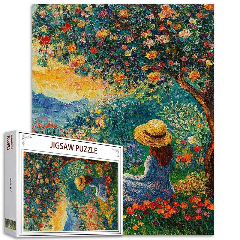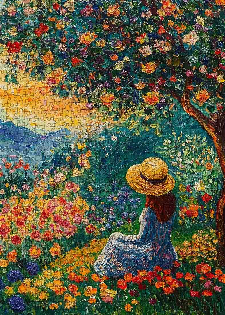 Eine Frau mit Sonnenhut sitzt friedlich unter einem blühenden Baum, umgeben von einem Meer aus leuchtenden Blüten. Die untergehende Sonne taucht die Hügel in der Ferne in goldene Farbtöne, als wäre die Zeit für diesen Moment der Besinnung stehen geblieben. Ihr Blick folgt dem gewundenen Gartenweg, auf dem Mohn und Rosen in einem Farbenrausch blühen. Jedes Stück erweckt den ruhigen Charme dieses Gartenparadieses zum Leben und lädt dazu ein, in seine ruhige und farbenfrohe Welt zu entfliehen.