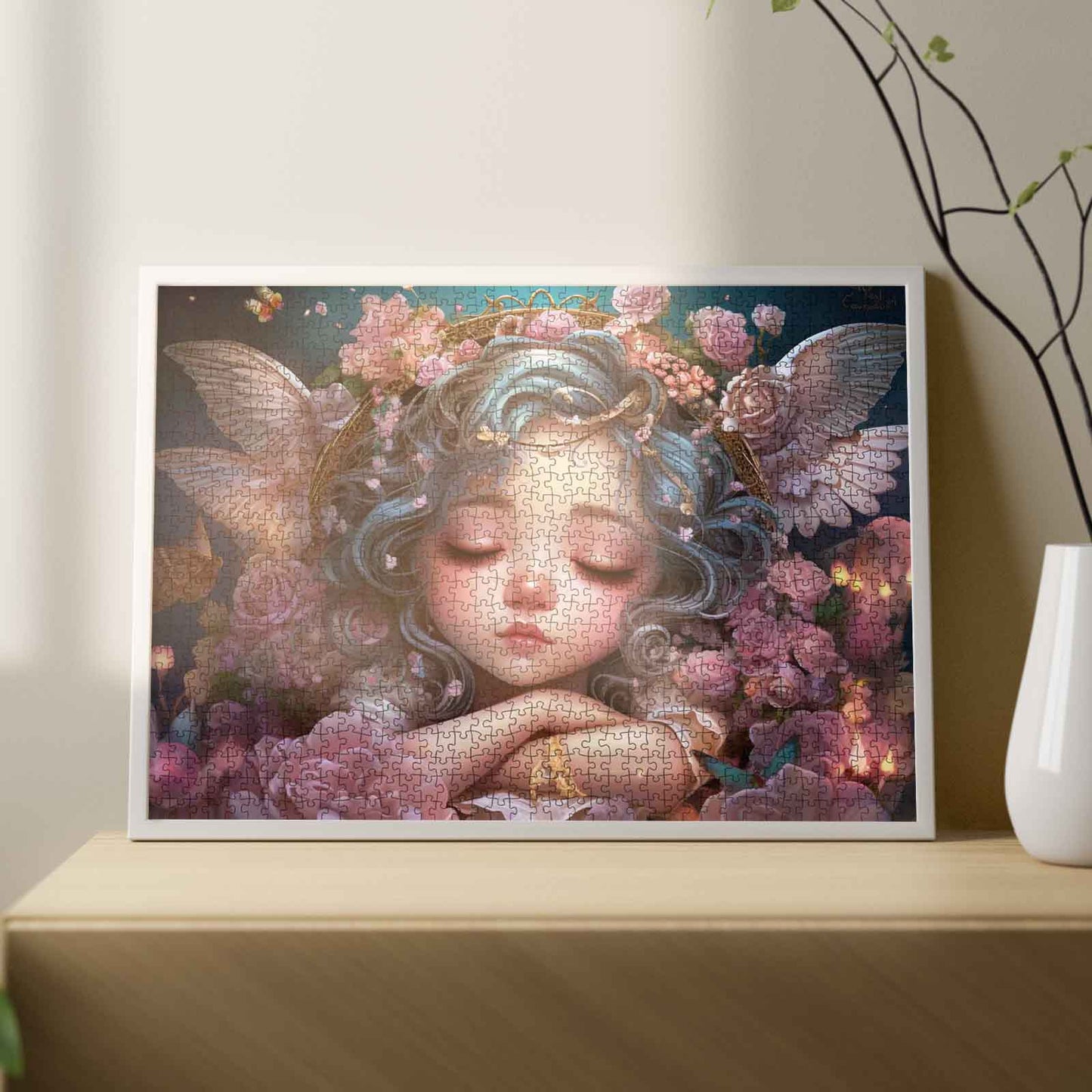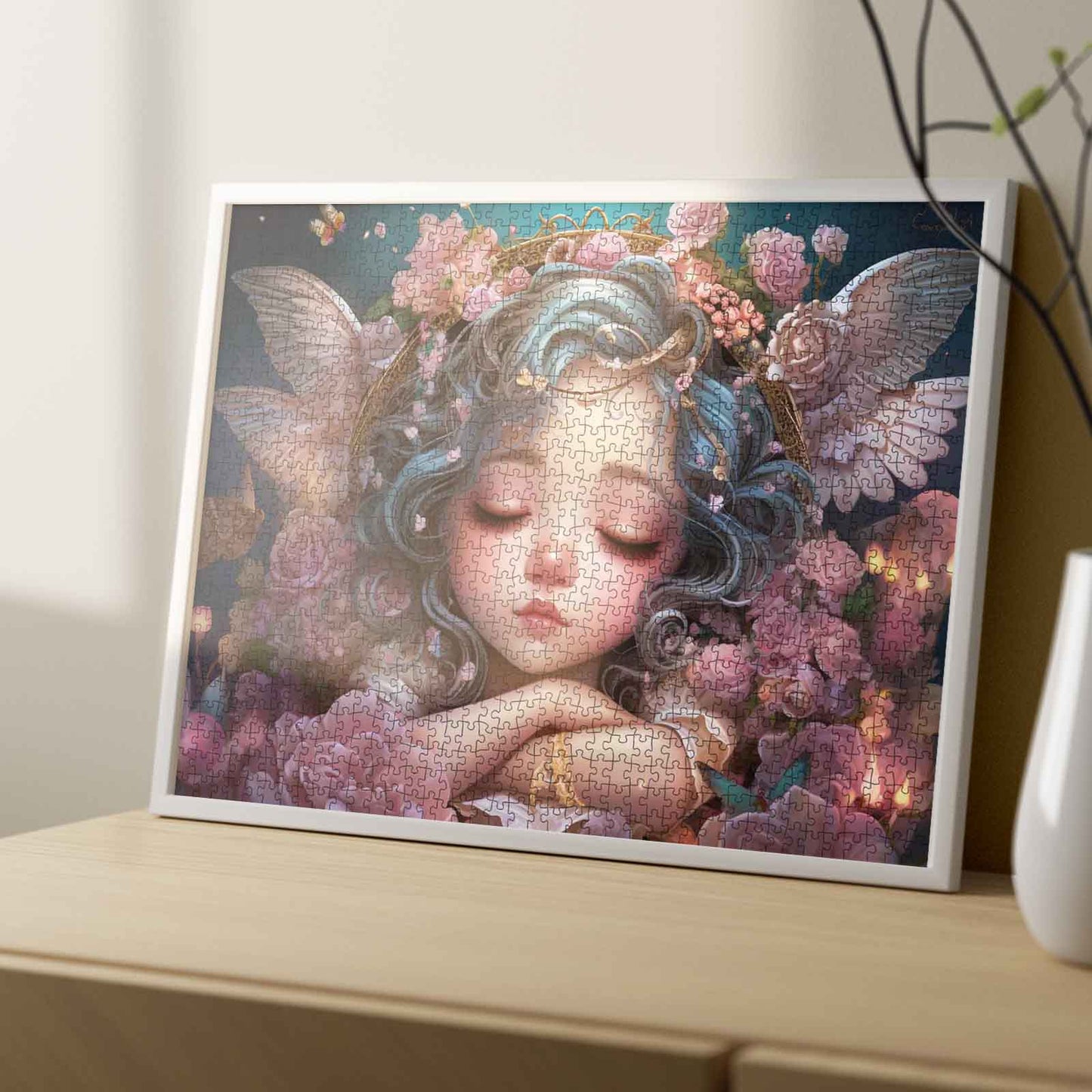 In dieser heiteren Szene ruht ein schlafender Engel mit zarten Flügeln friedlich inmitten eines Regens aus zartrosa Rosen und flatternden Schmetterlingen. Ihre sanfte, ätherische Schönheit besticht durch ihren heiteren Ausdruck und die friedliche Umgebung und bietet die perfekte Flucht in eine Welt der Ruhe. Dieses 1000-teilige Puzzle fängt die Essenz von Ruhe und Schönheit ein und ist eine lohnende Herausforderung für Puzzle-Fans. Die leuchtenden Farben der Rosen, Schmetterlinge und der leuchtende Heiligenschein des Engels laden Sie ein, in dieses beruhigende und bezaubernde Kunstwerk einzutauchen. Beim Zusammensetzen dieses Meisterwerks werden Sie spüren, wie der Stress der Welt von Ihnen abfällt und nur ein Gefühl von Frieden und Erfüllung zurückbleibt.