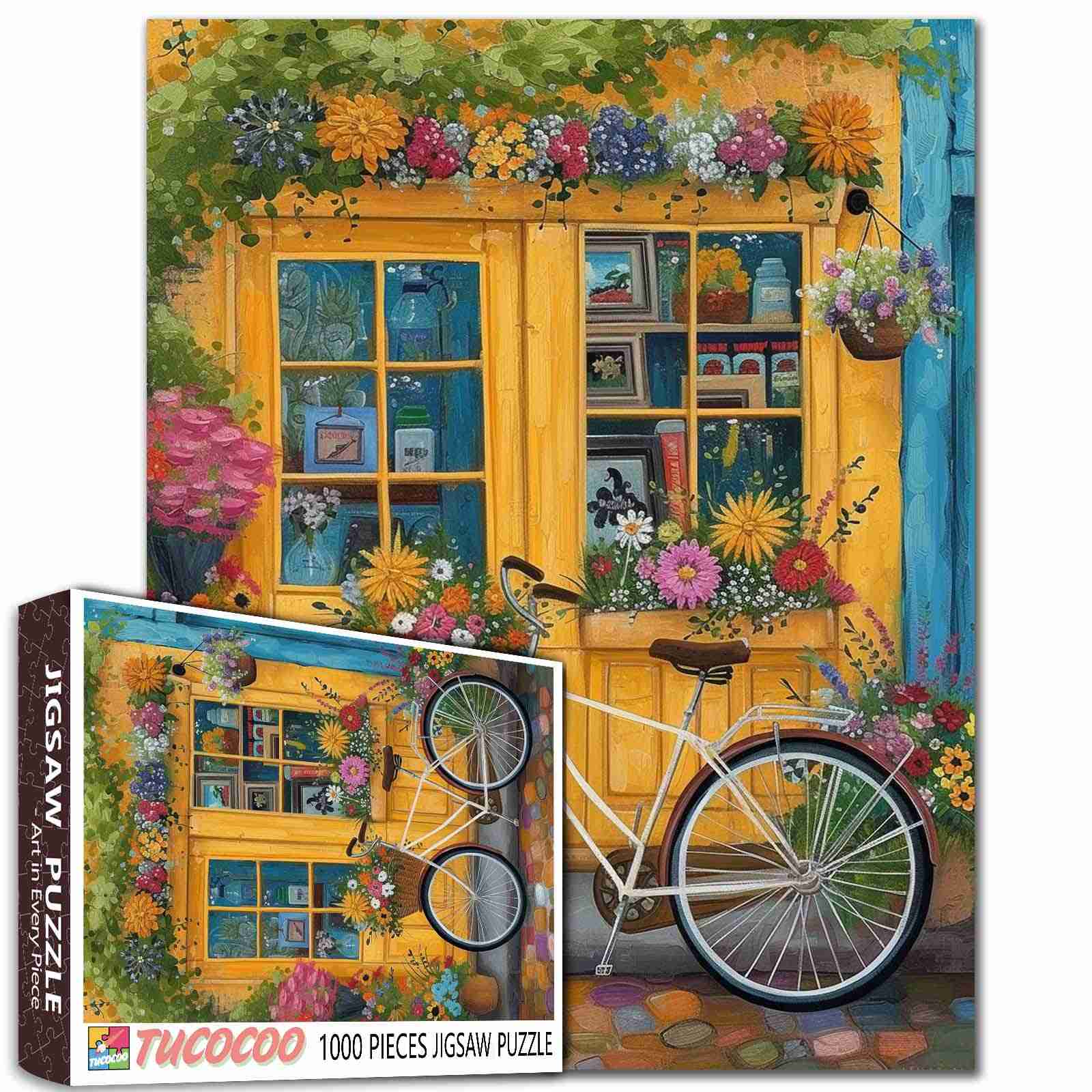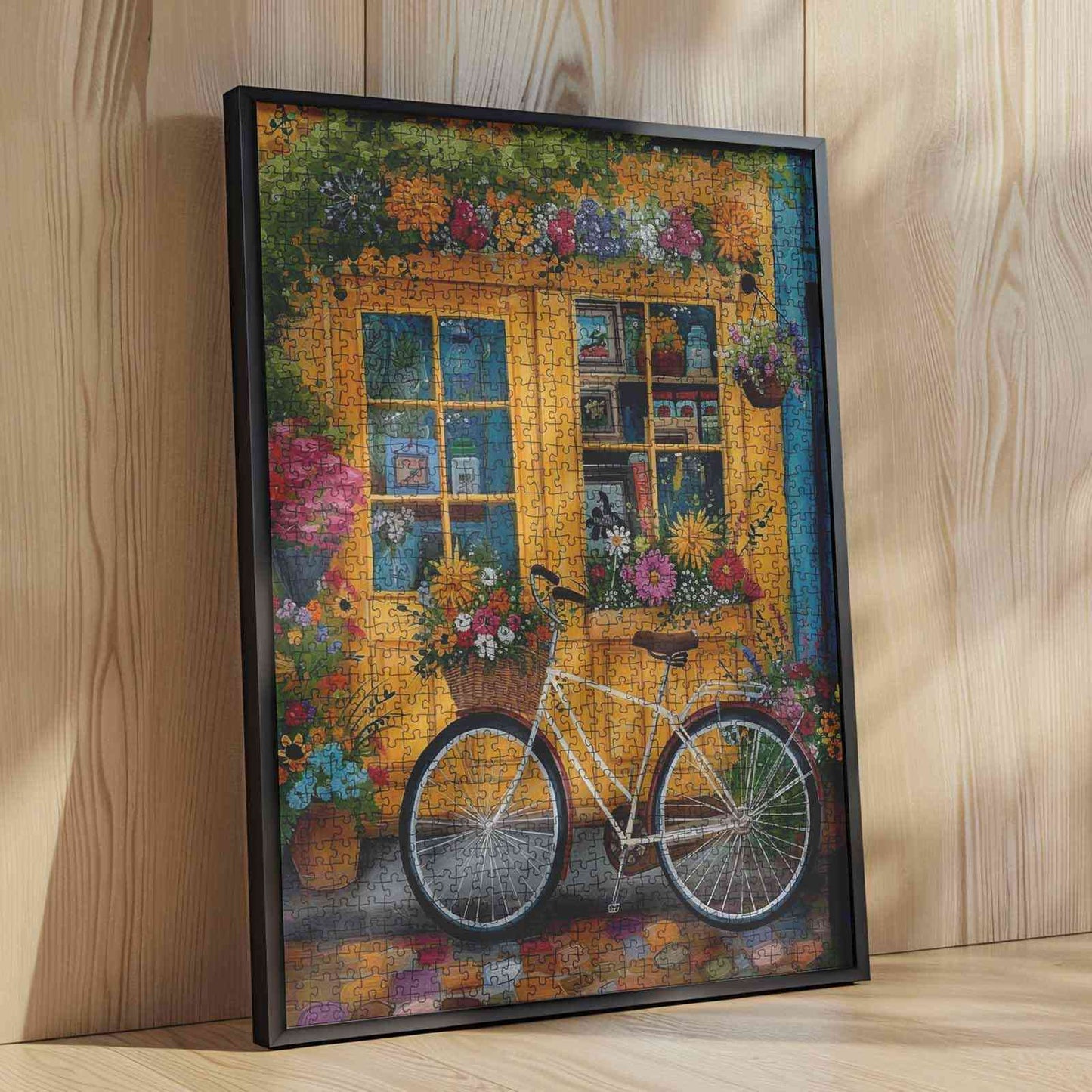 Eine fröhlich gelbe Schaufensterfront strotzt nur so vor Blumenfreude – Blumenkästen und Körbe quellen über vor Gänseblümchen, Sonnenblumen und wilden Gartenblumen. Davor parkt ein klassisches weißes Fahrrad, dessen Weidenkorb mit frischen Schnittblumen gefüllt ist. Hinter der Glasscheibe blicken Bilderrahmen und Bücher hervor und lassen die Geschichten erahnen, die im Inneren warten. Die bunten Fliesen unter den Füßen und der von oben herabhängende Efeu runden das Bild eines perfekten, friedlichen Nachmittags ab. Jedes Stück, das Sie platzieren, fühlt sich an, als würden Sie tiefer in einen Kleinstadttraum voller Sonnenschein und Gelassenheit eintauchen.