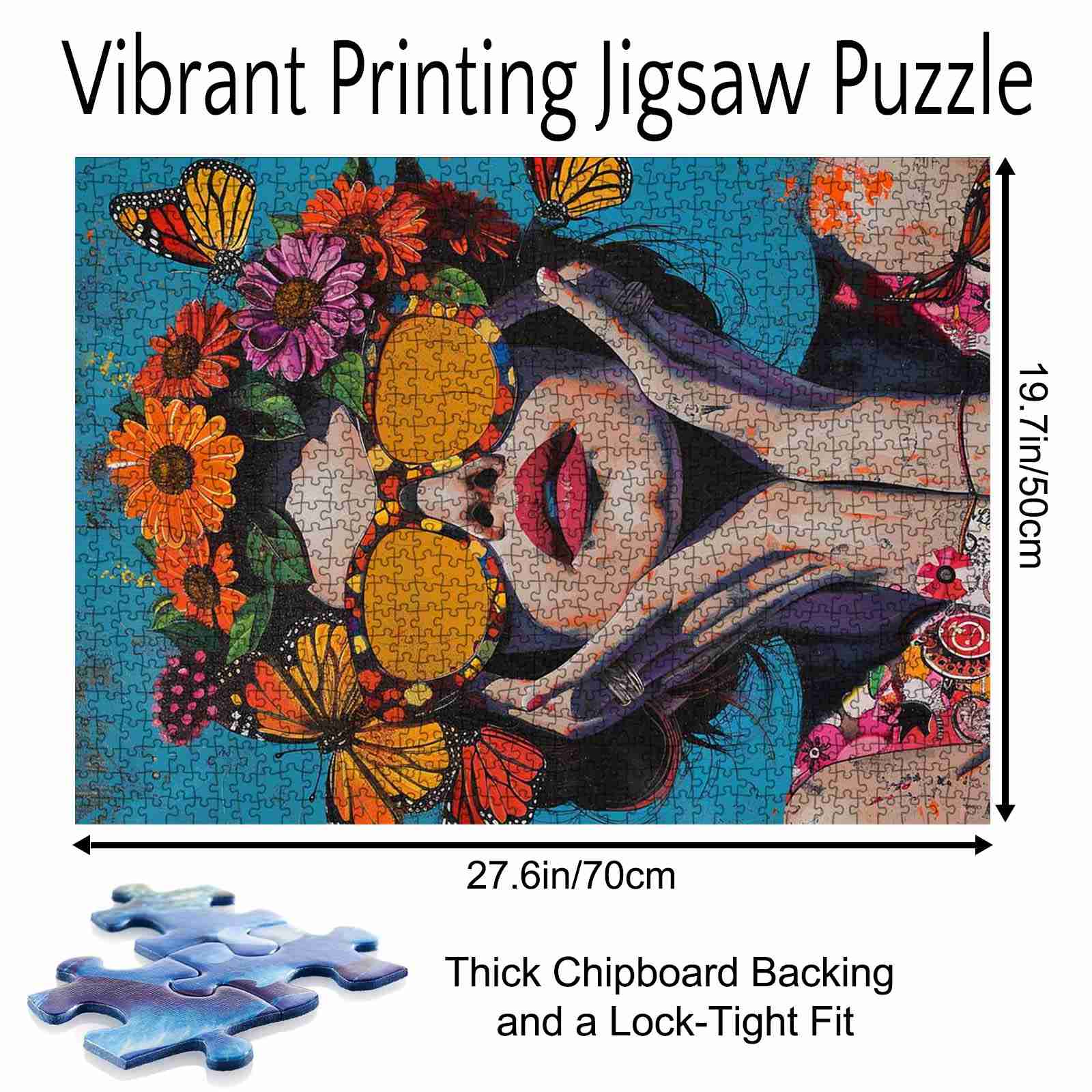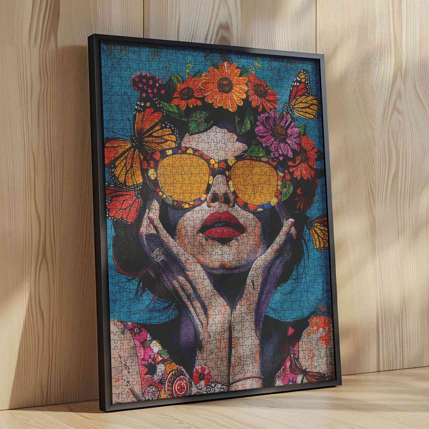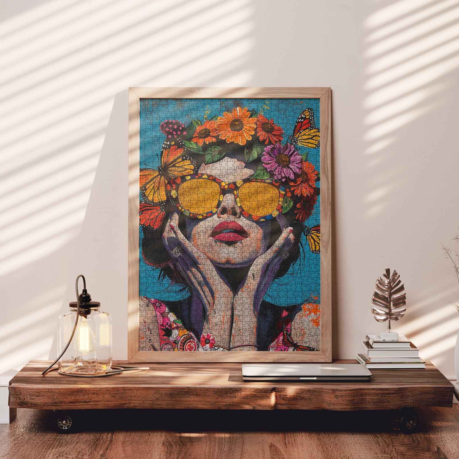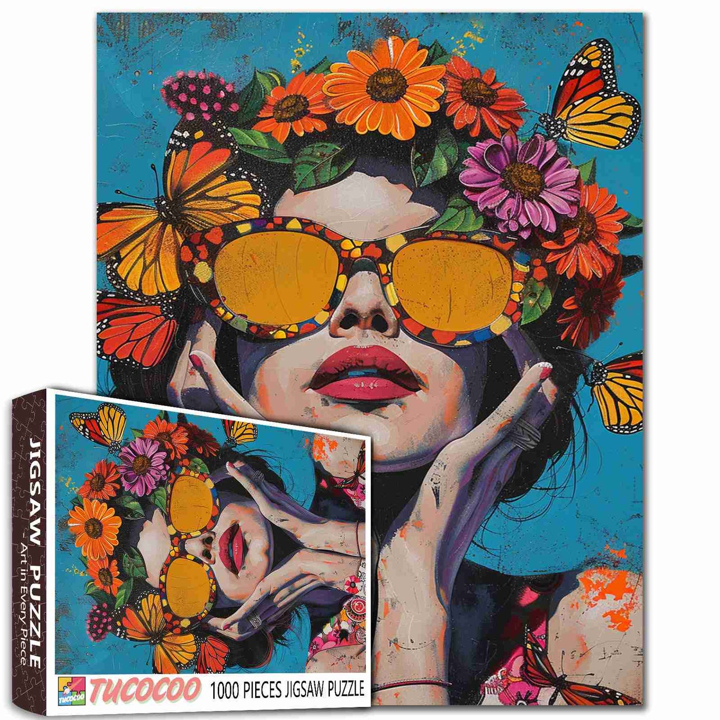 This jigsaw puzzle captures a chic and vibrant moment of a woman adorned with a crown of colorful flowers and butterflies, wearing bold yellow sunglasses. The mix of vibrant colors and artistic flair offers a fun, creative challenge. The combination of nature, fashion, and vibrant energy makes this puzzle perfect for anyone who enjoys puzzles with a playful, artistic twist. As you assemble the pieces, you’ll be immersed in a burst of color and creativity, perfect for puzzle lovers looking for a refreshing design.