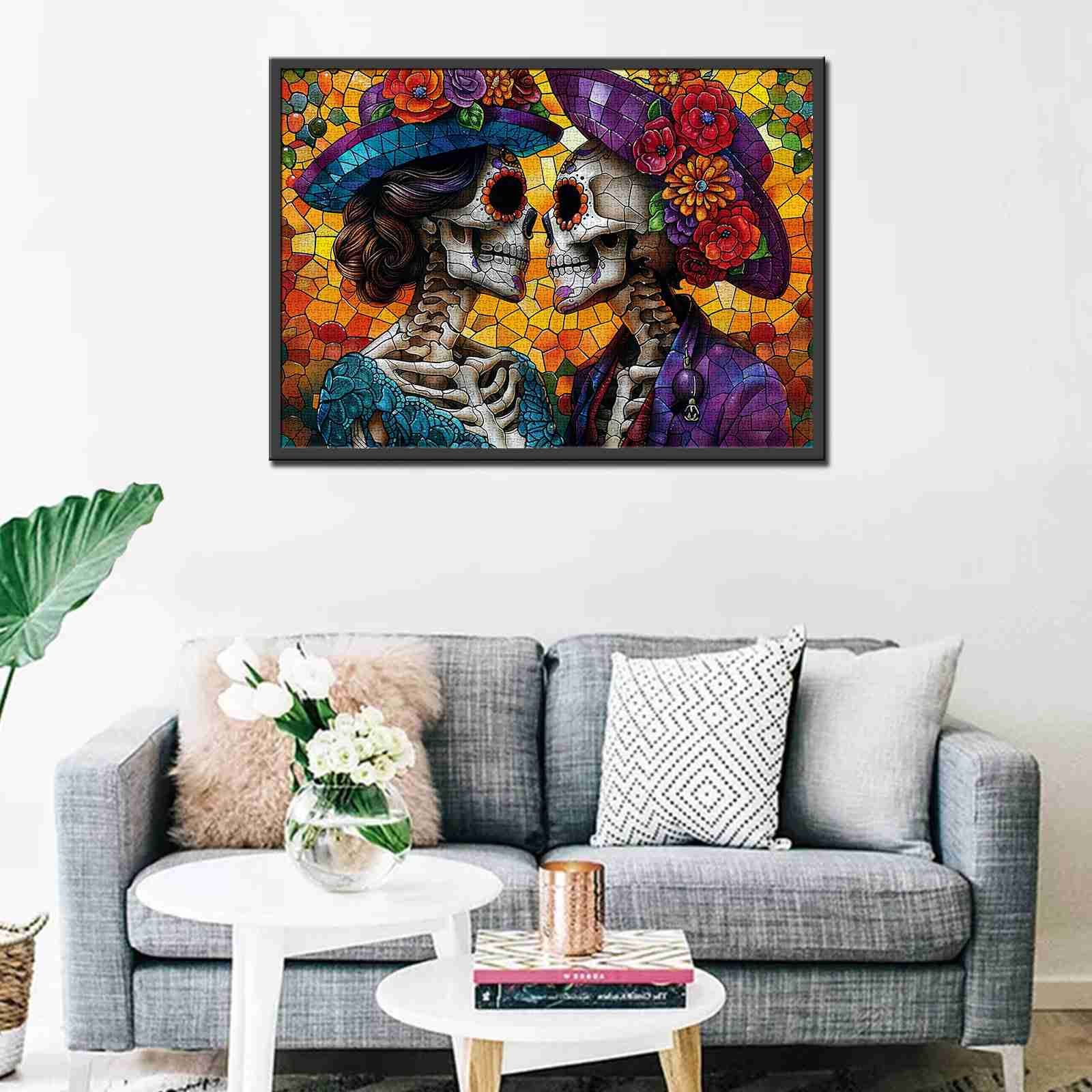 Celebrate eternal love with this vibrant stained glass jigsaw puzzle featuring two romantic skeletons adorned with colorful flowers and intricate details. The mosaic-like background radiates with warm tones of orange and yellow, creating a mesmerizing masterpiece that blends artistic expression and cultural charm. Perfect for puzzle enthusiasts and art lovers, this puzzle will brighten your day with its lively and unique design.