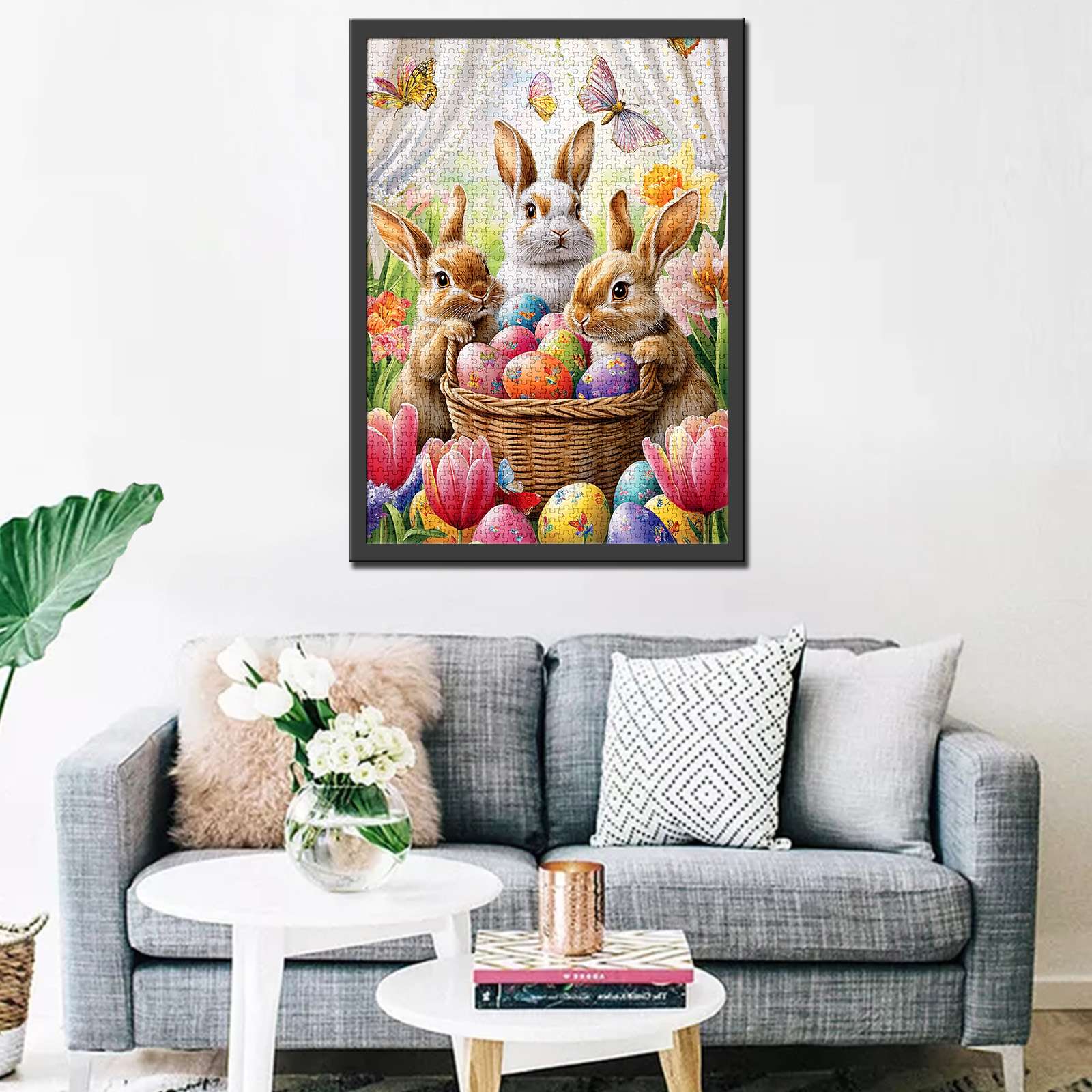 In a blooming spring garden, three adorable bunnies gather around a woven basket overflowing with brightly colored Easter eggs. Surrounded by tulips, butterflies, and daffodils, they share a moment of joyful wonder. Every detail in the scene, from the soft fur to the glowing petals, invites you to feel the freshness of the season and the innocence of the woodland friends. Perfect for bringing a touch of spring to any puzzle time.