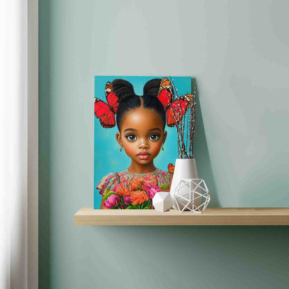 A young girl with luminous skin and deep, expressive eyes stands gently in front of a turquoise backdrop. Her hair is styled in two elegant buns, adorned with vivid monarch butterflies that rest like living ribbons. She's dressed in a floral top, with a leather satchel on her shoulder and a bouquet of blooming roses in her arms. Every element invites the painter to celebrate youthful grace, vibrant color, and the whimsical bond between child and nature. Painting this serene scene is not only calming but also filled with tender life and joyful harmony.