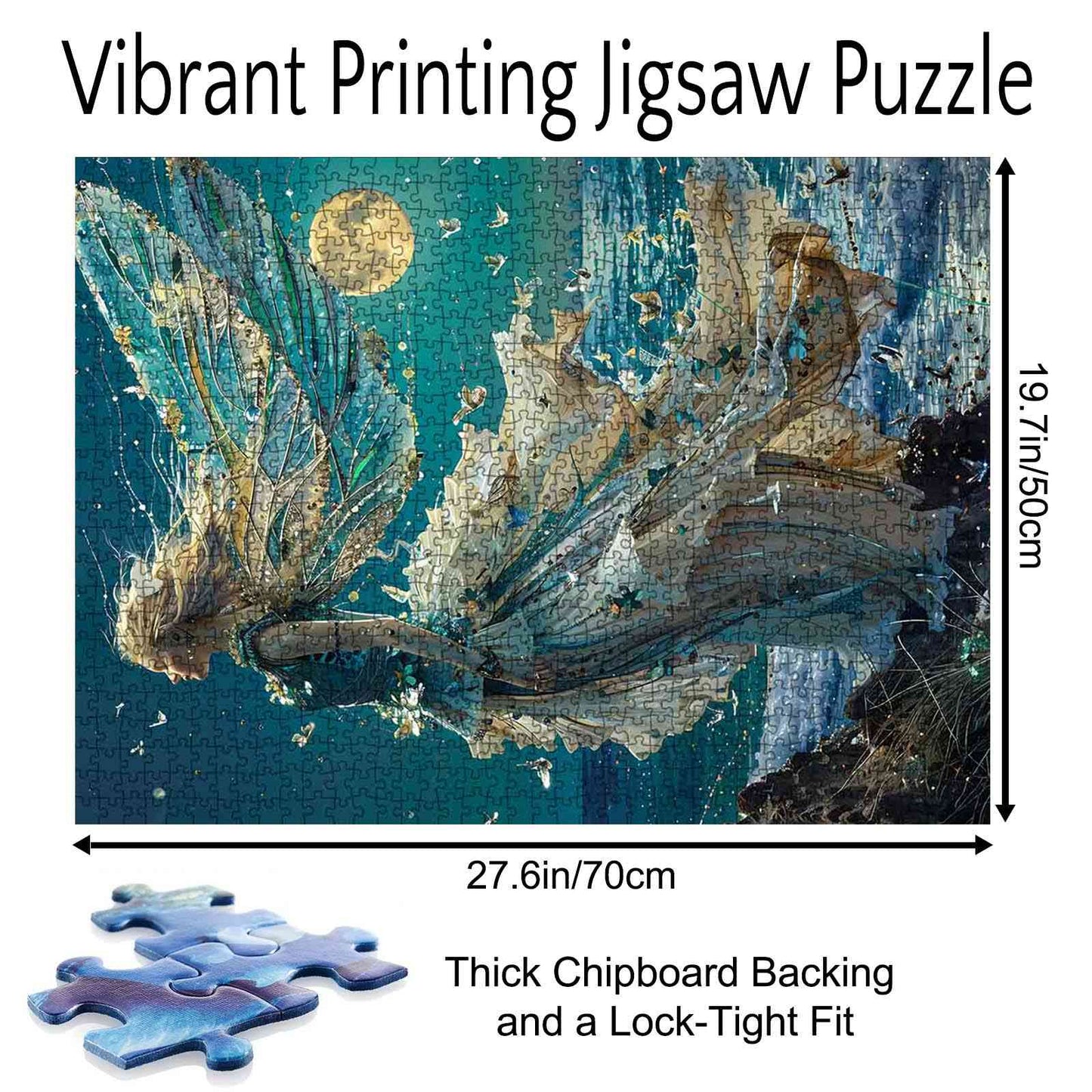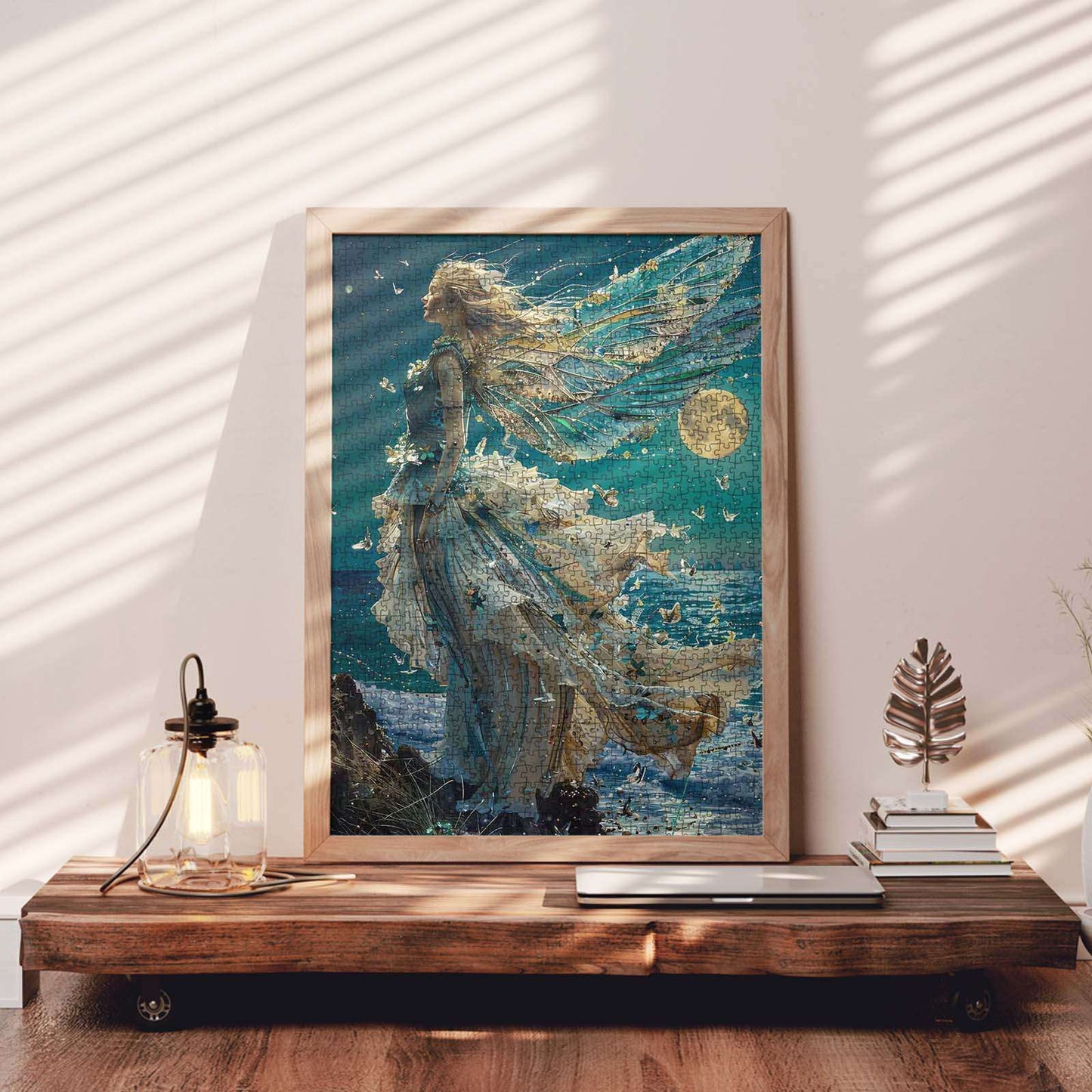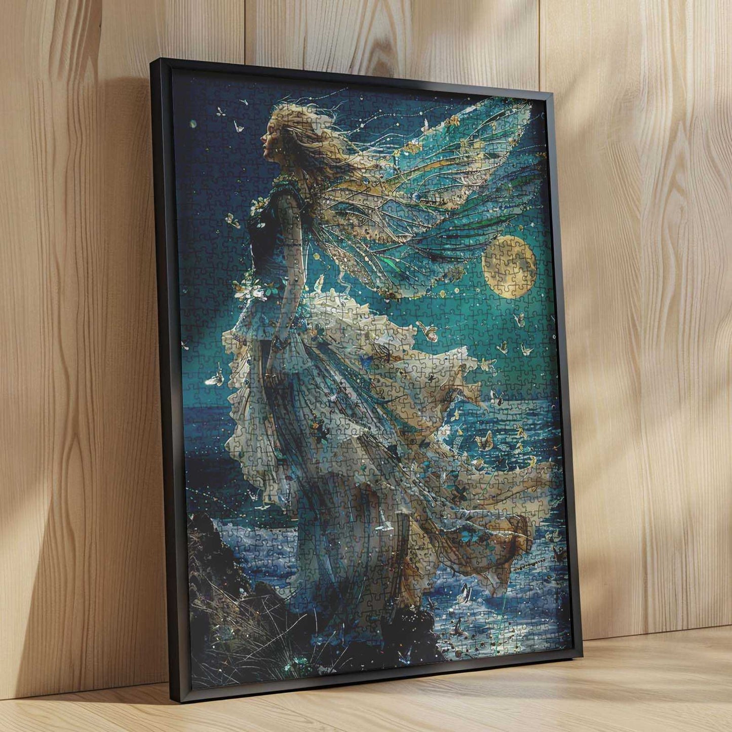 Immerse yourself in a magical night scene with our Fairy Jigsaw Puzzle. A delicate fairy, with wings shimmering under the full moon, stands by the ocean as her gown and hair flow in the breeze. Surrounded by tiny glowing creatures and serene waves, this puzzle invites you to piece together a world of wonder and elegance. Perfect for those seeking a touch of fantasy and relaxation.