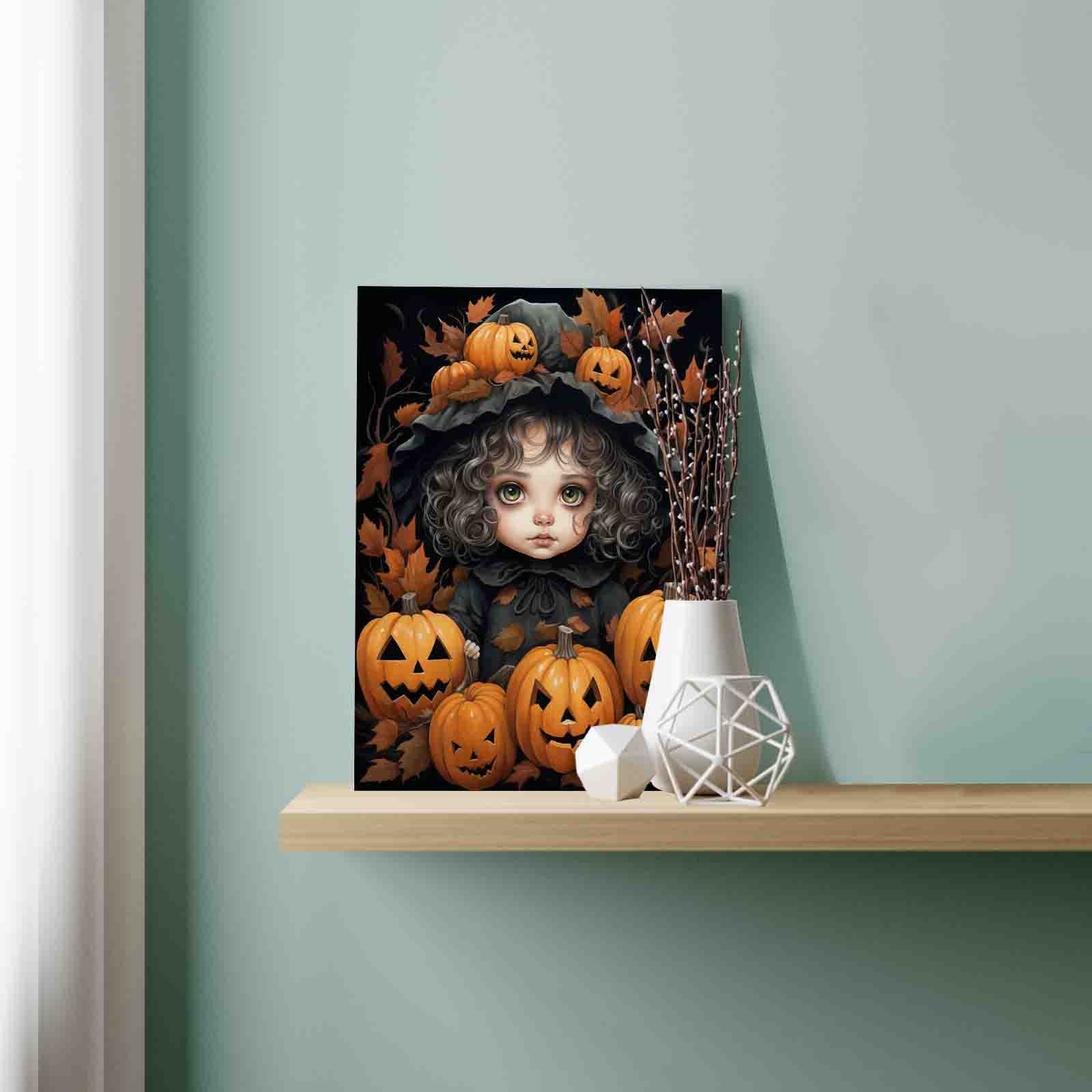Amid golden leaves and flickering pumpkins, a little girl stands wrapped in autumn’s spell. Her soft curls peek from beneath a hood adorned with jack-o'-lanterns, blending innocence with Halloween charm. Surrounding her are glowing pumpkins carved with mischief and warmth. The scene captures a quiet moment between eerie and enchanting, inviting you to bring it to life stroke by stroke.