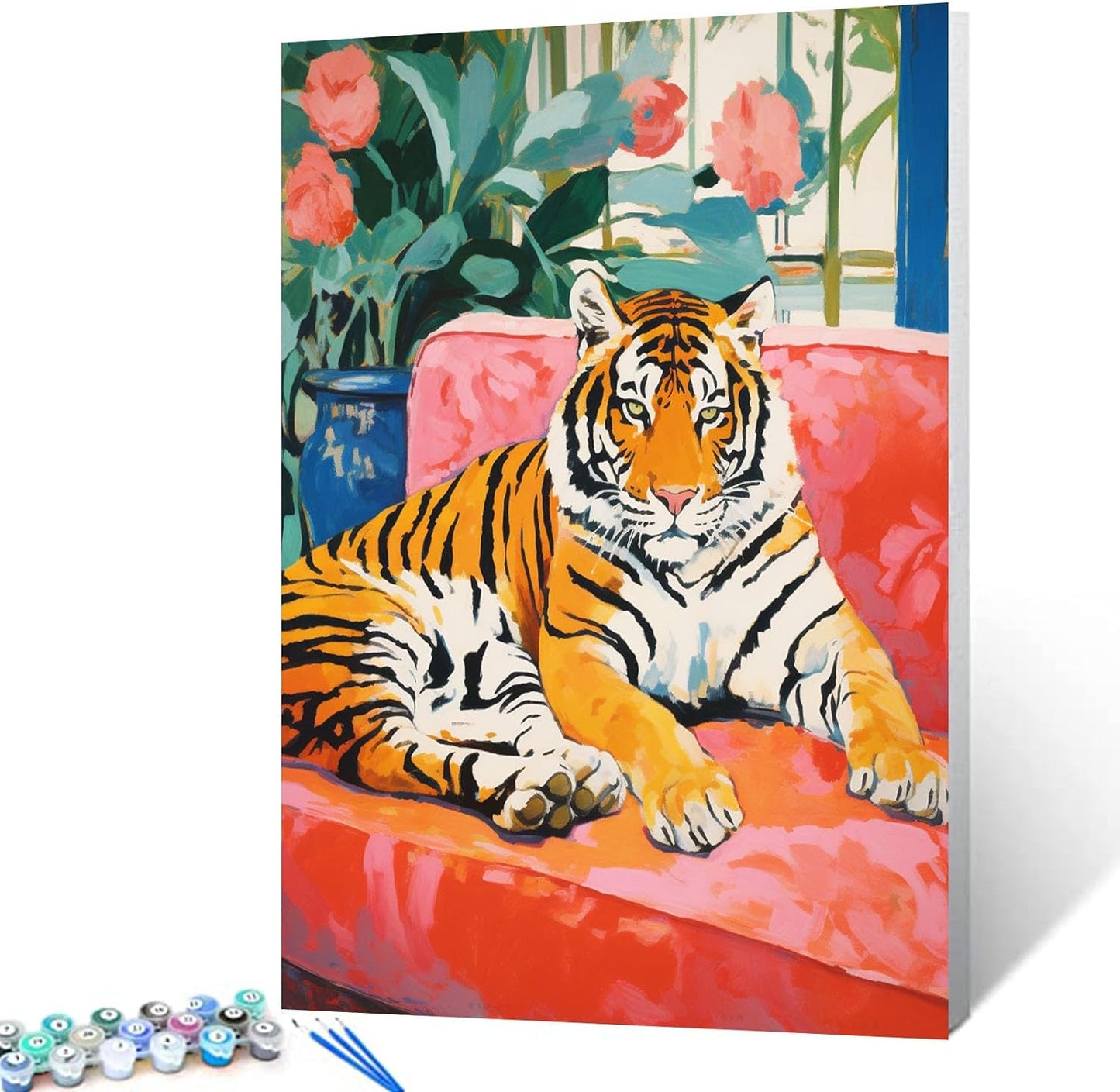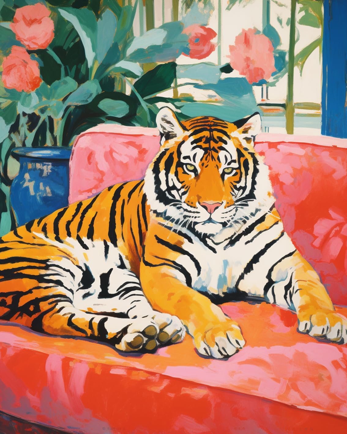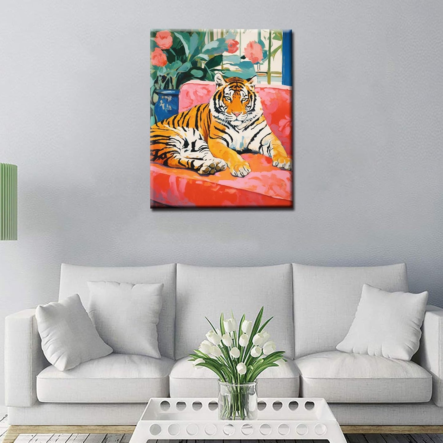 A majestic tiger reclines confidently on a warm-toned sofa, basking in sunlight filtered through leafy plants and pink blossoms. The bold brushstrokes and rich colors turn this powerful predator into a picture of relaxed elegance. With vibrant reds, oranges, and greens creating a tropical harmony, the scene feels alive yet serene. Painting this bold composition invites you to capture both strength and stillness, making it a perfect project for anyone who loves animals, modern color palettes, and statement art.
