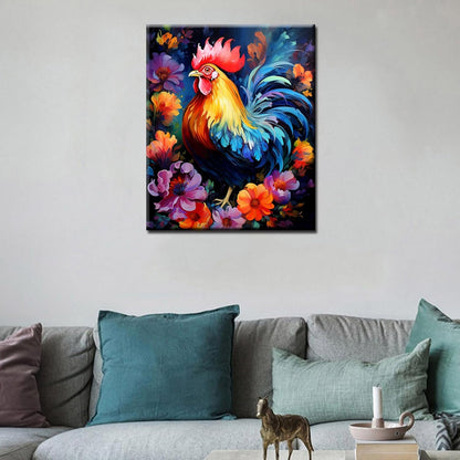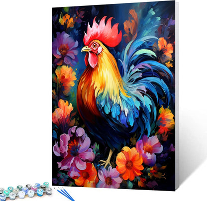 Peinture par numéros d'un coq abstrait parmi les fleurs