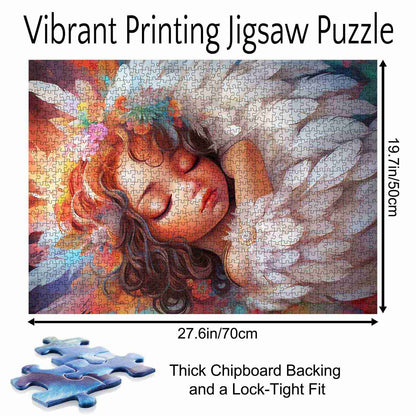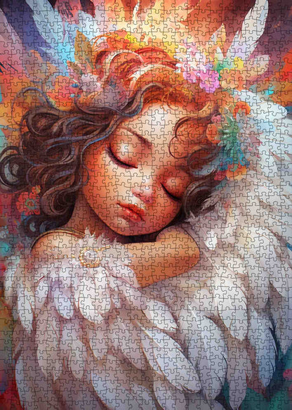 Un ange serein repose paisiblement, sa chevelure vibrante ornée de fleurs colorées. Ses ailes délicates, pures comme la neige, semblent la protéger dans ce décor onirique. Entourée de teintes douces, elle semble préservée du chaos du monde, symbole de calme et de beauté. Cette œuvre vous invite à vous immerger dans cette douce atmosphère et à reconstituer son univers paisible. Parfaite pour les amateurs de puzzles et ceux qui recherchent un moment de paix au cœur de la vie trépidante.