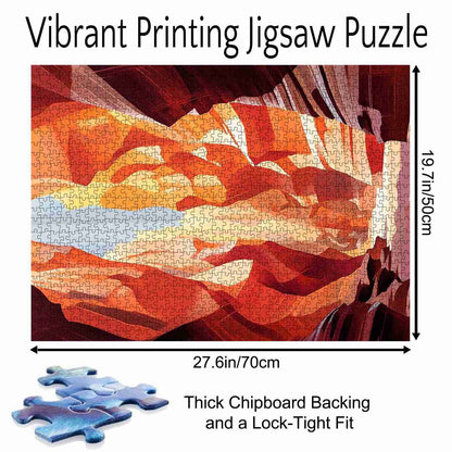 Sculptées par le temps et illuminées par des rayons changeants, les parois du canyon se tordent comme des flammes dans des tons de pourpre, d'ambre et d'ivoire. Ce tableau saisissant capture le cœur d'Antelope Canyon, où la lumière du soleil filtre à travers d'étroits passages de pierre et dessine des vagues lumineuses sur le grès. À mesure que vous assemblez chaque pièce, les motifs révèlent les coups de pinceau de la nature : fluides, audacieux et infiniment fascinants. Un puzzle pour les amoureux des merveilles naturelles, de la solitude paisible et de la beauté radieuse du désert.