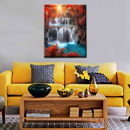 Découvrez la sérénité avec notre peinture par numéros Autumn Sunset Waterfall. Cette scène captivante présente un coucher de soleil radieux sur des cascades en cascade, encadrées de feuilles d'automne vibrantes. Les rouges brillants et les bleus profonds créent un contraste magique, capturant l'essence paisible de la nature pendant que vous peignez.