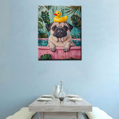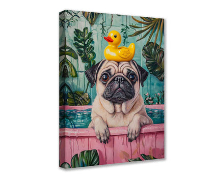 Toile murale représentant un carlin dans une baignoire avec un canard en caoutchouc