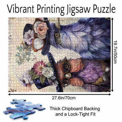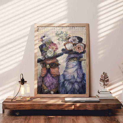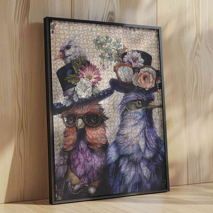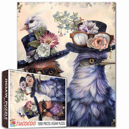 - Ce magnifique puzzle représente deux oiseaux colorés portant des chapeaux et des lunettes, entourés de fleurs. C'est le moyen idéal pour se détendre et se déstresser après une longue journée.