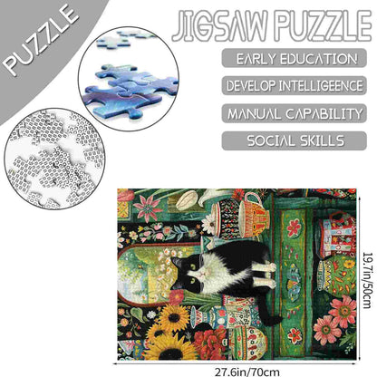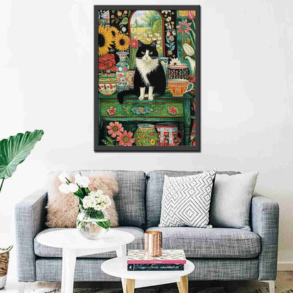 Un chat noir et blanc, digne, trône fièrement sur une armoire peinte en vert, entouré de pichets et de vases en céramique colorés ornés de fleurs cueillies à la main. Derrière lui, une fenêtre dévoile un jardin paisible, parsemé de tournesols, de marguerites et d'abeilles bourdonnantes. L'atmosphère évoque un matin de campagne paisible, où le chat règne en observateur serein de son royaume floral. Ce puzzle vous invite à découvrir un univers chaleureux et pictural, plein de couleurs vives et de charme.