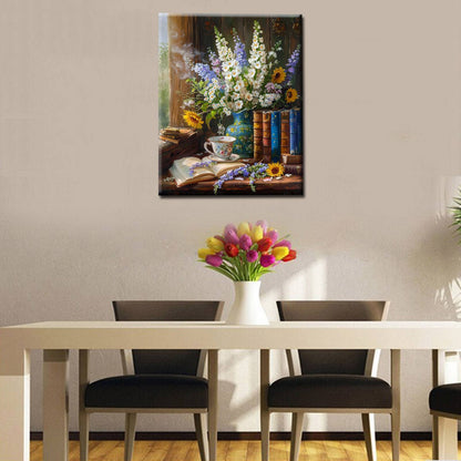 Créez un havre de paix avec cette peinture par numéros comprenant une table en bois rustique ornée de fleurs en fleurs, de livres élégants et d'une tasse de thé fumante. La lumière du soleil qui traverse la fenêtre ajoute chaleur et charme à ce design complexe, le rendant idéal pour la détente et l'amélioration de la décoration de votre maison. Parfait pour les débutants et les amateurs d'art.
