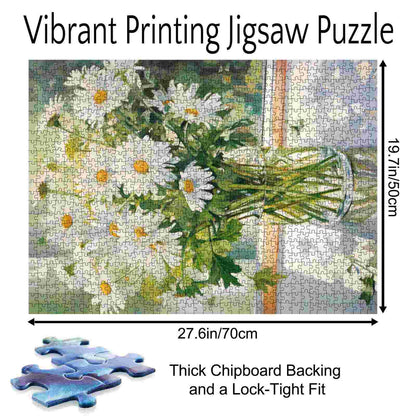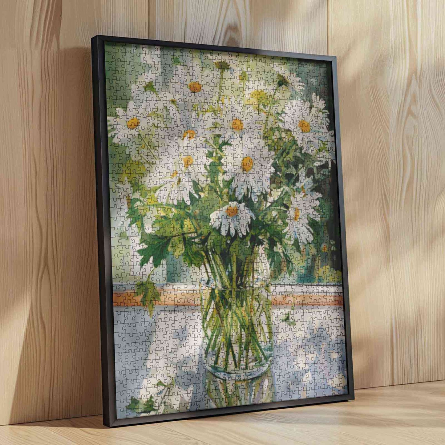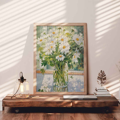Un vase de marguerites blanches fraîches baigne dans la douce lumière du soleil près de la fenêtre. Leurs pétales délicats et leurs joyeux cœurs dorés semblent rayonner de vie, projetant de doux reflets sur la surface polie en dessous. La légère brise apporte au paysage un charme paisible et naturel qui capture la beauté fugace d'une matinée ensoleillée.