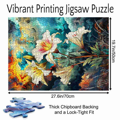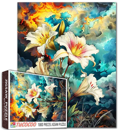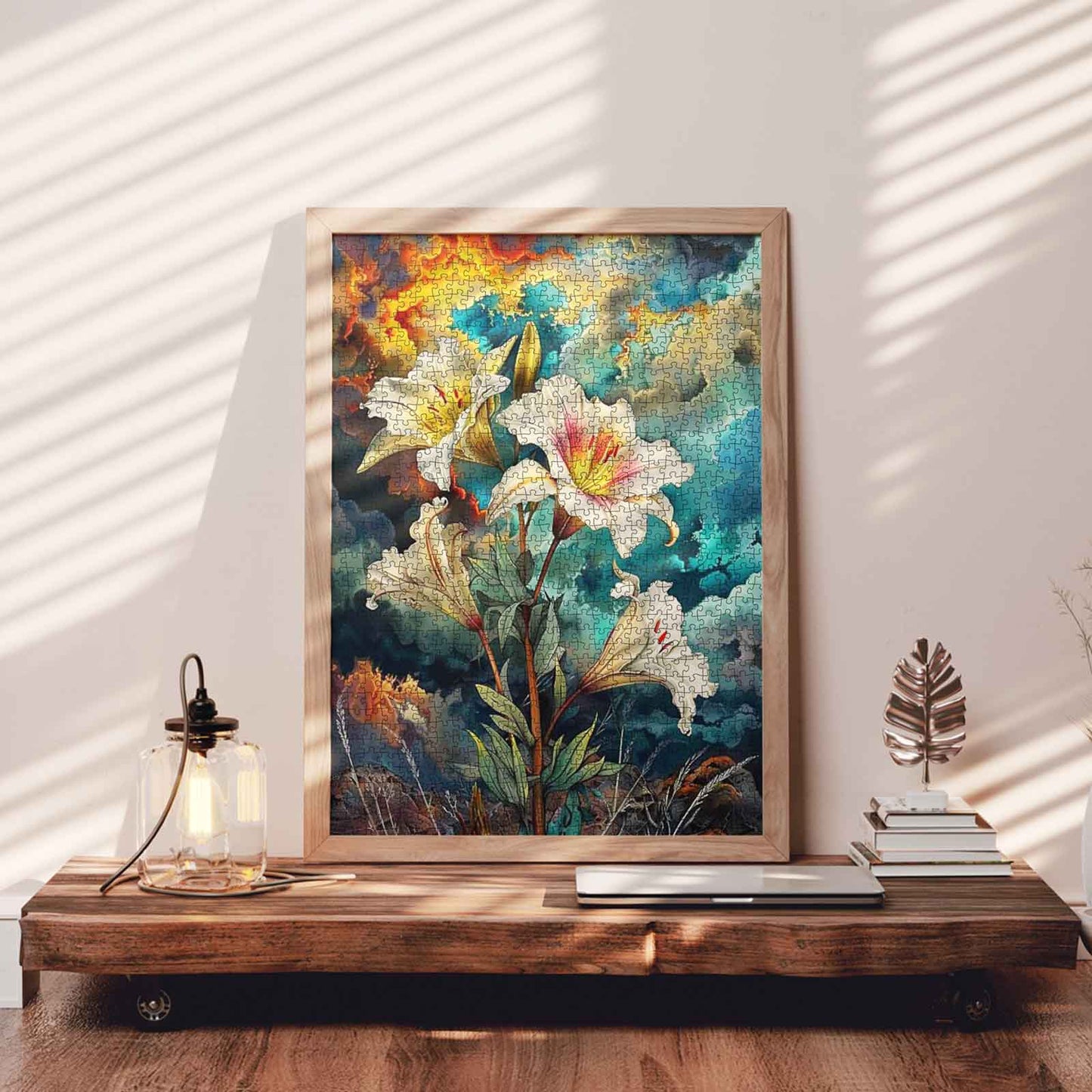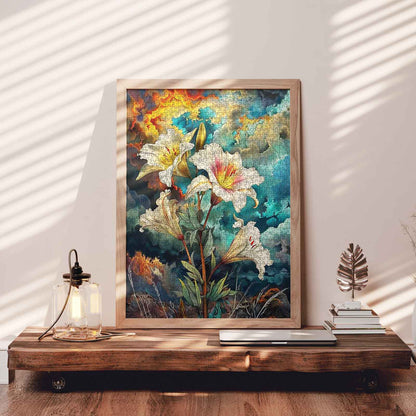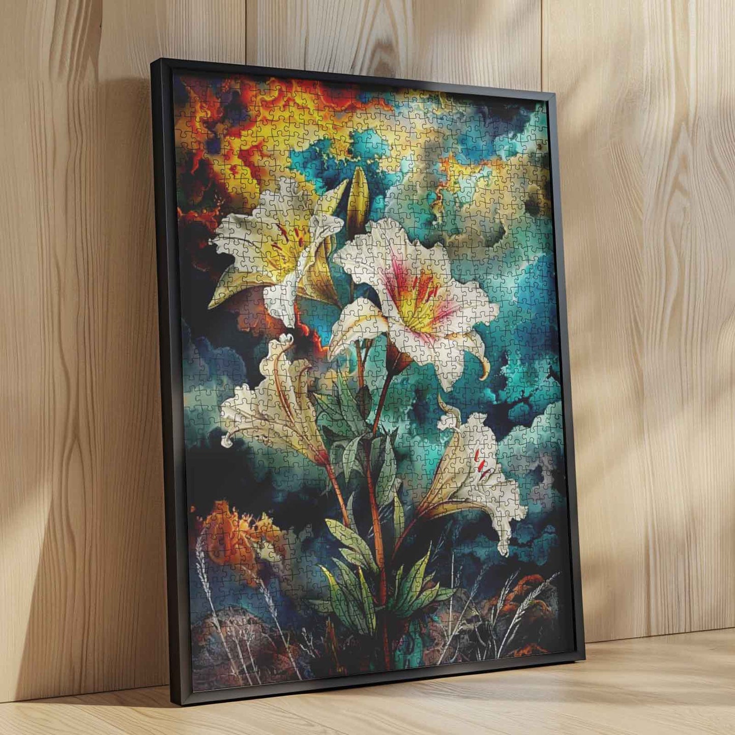 Sous un ciel dramatique où flammes et orages s'entrechoquent, de grands lys blancs s'élèvent avec une grâce époustouflante. Leurs pétales, caressés par le soleil et l'ombre, semblent danser sur les nuages tourbillonnants. Chaque œuvre vous plonge au cœur de cette puissante scène de résilience et de beauté, où la force délicate de la nature transparaît à travers le chaos.