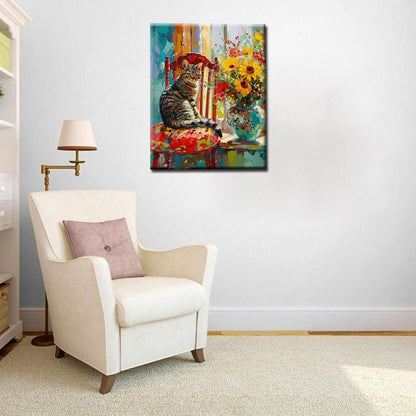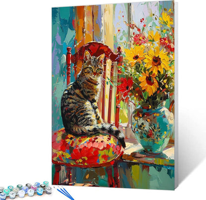Chat sur une chaise rouge à côté de tournesols Peinture par numéros