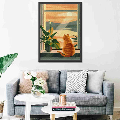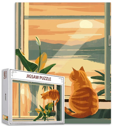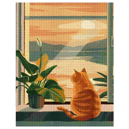 Une soirée paisible s'ouvre tandis qu'un chat roux curieux se perche sur le rebord d'une fenêtre, fasciné par le coucher de soleil éclatant. Des collines ondulantes se fondent dans l'horizon orangé et doré, projetant de longues ombres sur l'eau calme en contrebas. Des plantes d'intérieur luxuriantes encadrent la fenêtre, apportant une douce et chaleureuse harmonie à la lumière chaude du dehors. Le chat a le dos tourné, mais son regard attentif et sa posture paisible nous invitent à partager ce moment de calme. Ce puzzle capture une douce scène de beauté quotidienne et d'introspection, parfaite pour tous ceux qui apprécient le calme et la tranquillité.