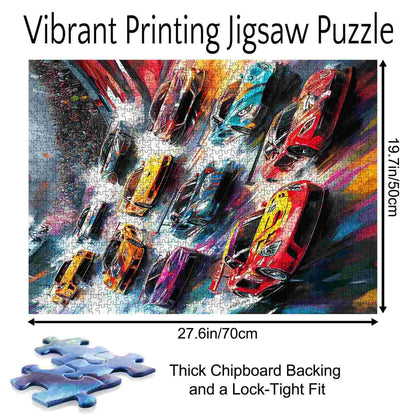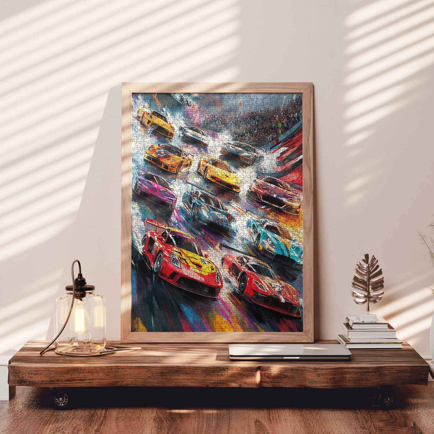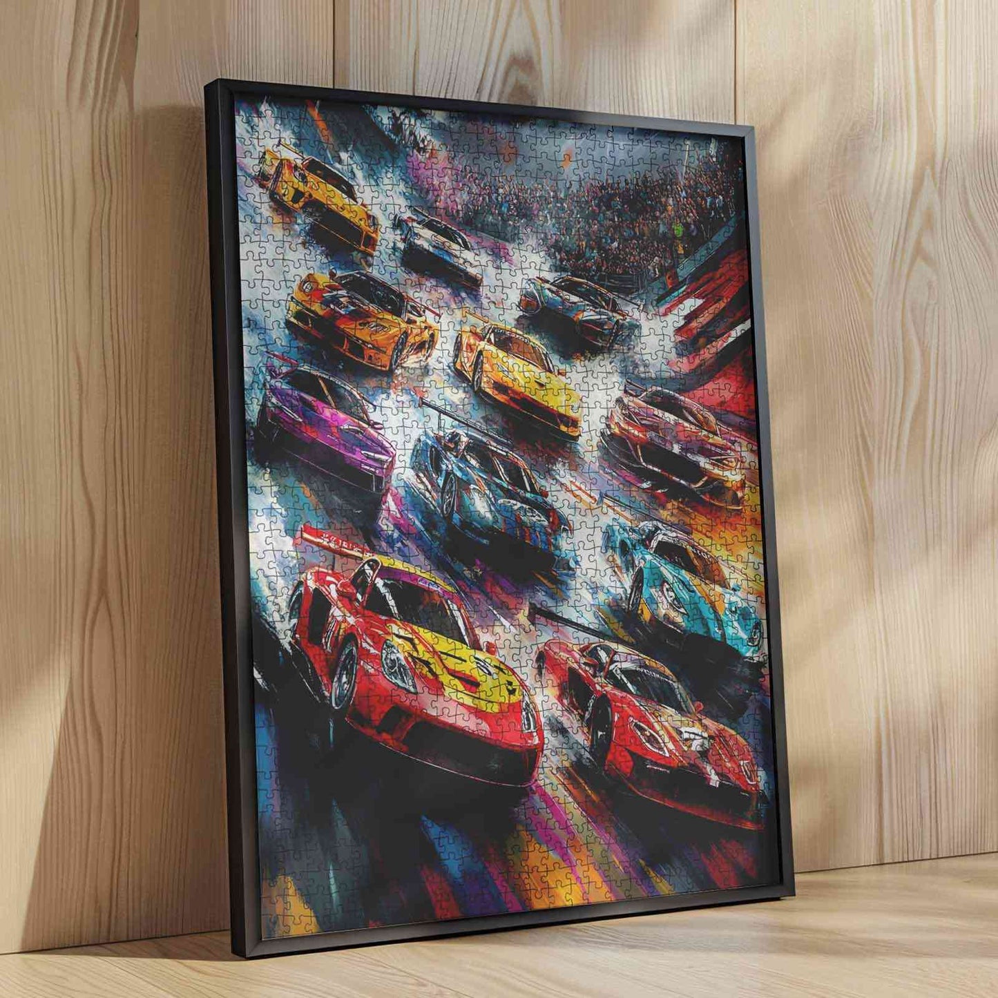 Les moteurs rugissent et les pneus crissent tandis qu'une flotte de bolides de course haute performance s'élance à toute allure dans les courbes glissantes d'un circuit bondé. Chaque voiture, parée de couleurs vives et de designs distinctifs, se bat pour sa place sous les projecteurs du stade et un ciel chargé de vitesse et de suspense. Les reflets sur l'asphalte mouillé reflètent l'intensité du moment : chaos, contrôle et compétition à la fois. Chaque pièce du puzzle s'emboîte comme un engrenage, augmentant progressivement le frisson de la course. Un incontournable pour tous ceux qui vivent pour la puissance, la rivalité et la vitesse brute.