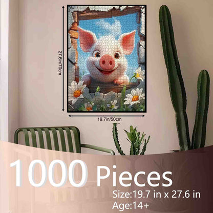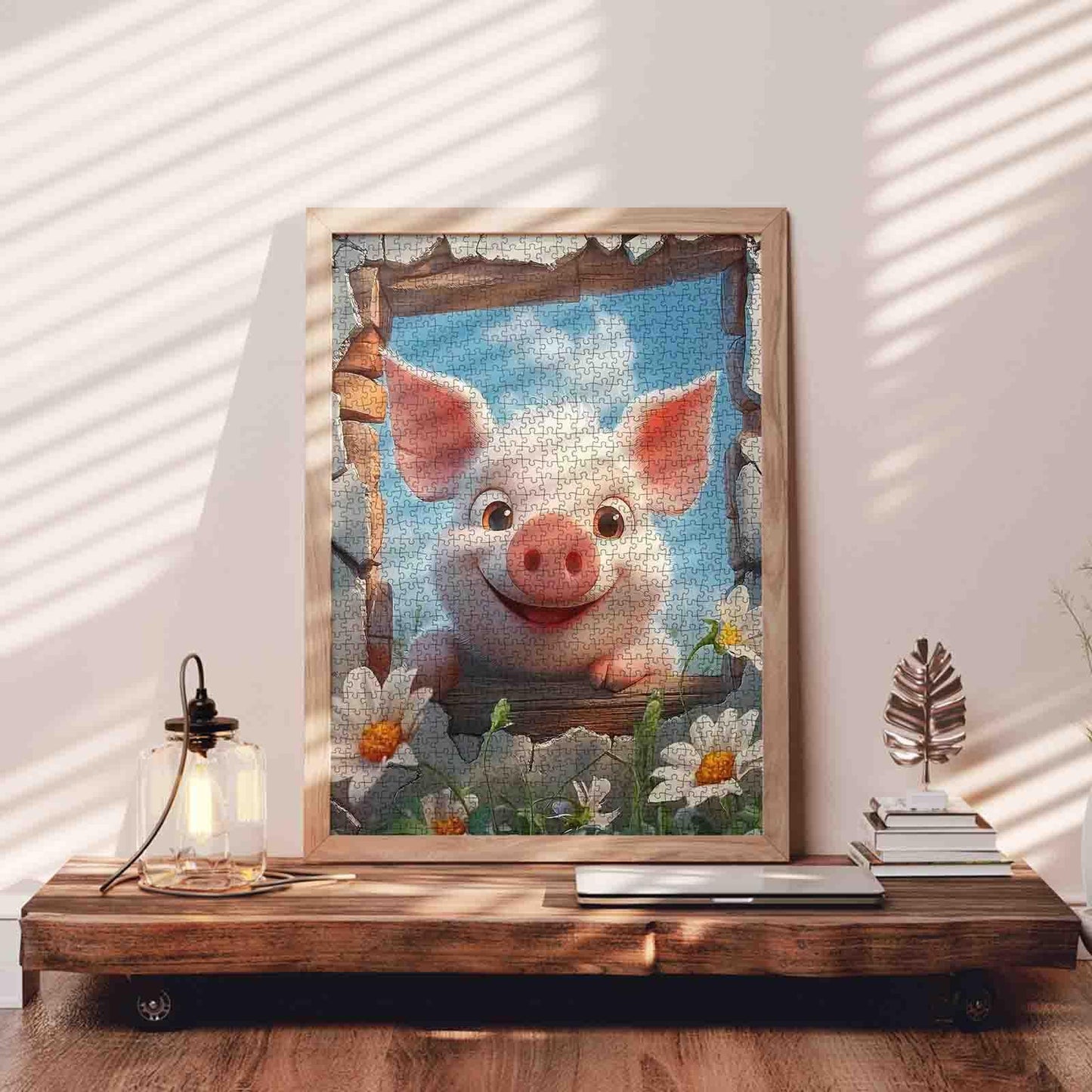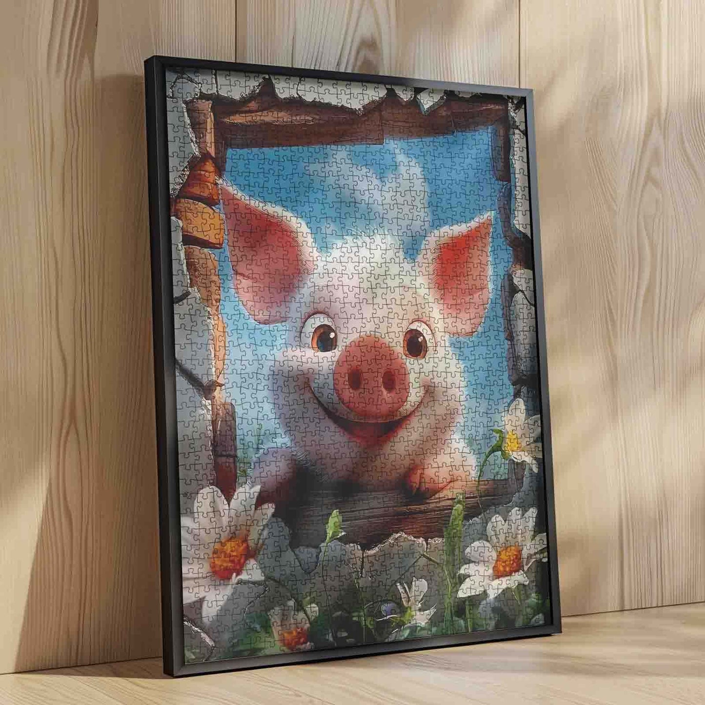 Un joyeux petit cochon regarde à travers un cadre en bois rustique, entouré de soleil, de marguerites blanches et d'un ciel bleu. Son large sourire et ses yeux curieux apportent chaleur et joie, comme si vous étiez accueilli par un nouvel ami de la ferme. Chaque pièce du puzzle ajoute au charme d'une paisible journée à la campagne, capturant un moment de bonheur simple et sain. Idéal pour les amoureux des animaux et des scènes de ferme légères, ce puzzle est une délicieuse façon de se détendre et de sourire en voyant ce joyeux cochon prendre vie.