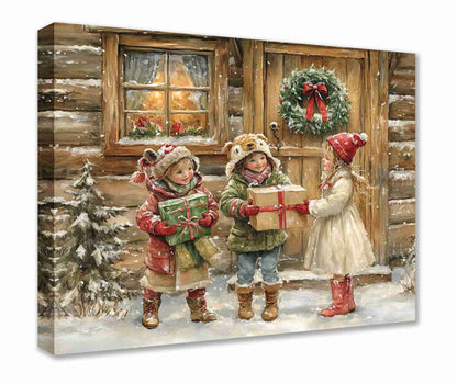 Dans une scène hivernale chaleureuse, trois enfants, emmitouflés dans des manteaux chauds et des chapeaux de fête, échangent des cadeaux devant une cabane recouverte de neige. La douce lueur de la fenêtre de la cabane et la couronne sur la porte ajoutent une touche de charme festif à ce moment réconfortant. Cette œuvre d'art capture l'innocence et la joie d'un Noël traditionnel, ce qui en fait un ajout parfait à votre décor de vacances. Laissez cette scène d'émerveillement de l'enfance apporter chaleur et esprit festif dans votre maison.