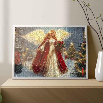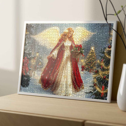- Ce magnifique puzzle de Noël représente un magnifique ange aux ailes dorées, vêtu d'un manteau rouge, marchant dans un pays des merveilles enneigé. La scène est agrémentée de lumières scintillantes, d'arbres décorés et d'un panier de houx, capturant la magie de Noël.