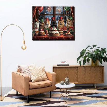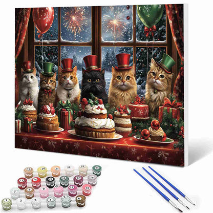 Célébrez les fêtes avec cet adorable kit de peinture par numéros ! Il met en scène six adorables chatons portant des chapeaux de fête et profitant d'un festin de Noël près de la fenêtre. La scène est complète avec des cadeaux, un gâteau et une vue sur un pays des merveilles enneigé. C'est le projet parfait pour une activité de vacances amusante et relaxante !