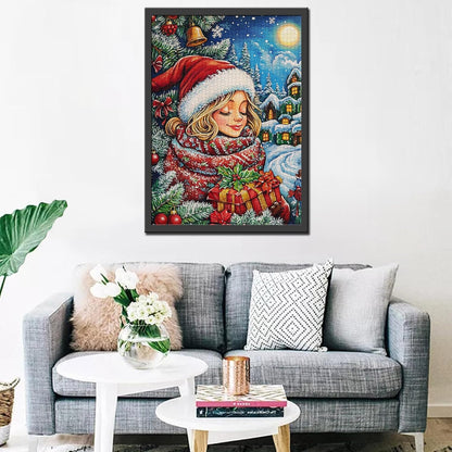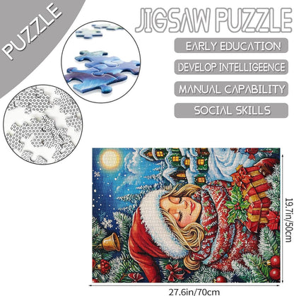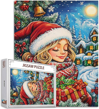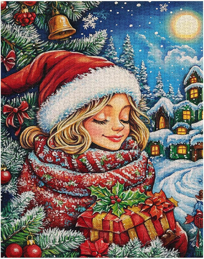 • Ce magnifique puzzle représente une charmante jeune fille portant un bonnet de Père Noël, tenant un cadeau emballé et contemplant une scène hivernale enneigée. Les lumières scintillantes des maisons au loin, la neige qui tombe et la lueur chaleureuse de la lune créent une atmosphère de Noël vraiment magique. Ce puzzle apportera joie et esprit festif à n'importe quelle maison.