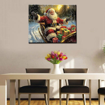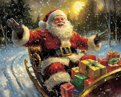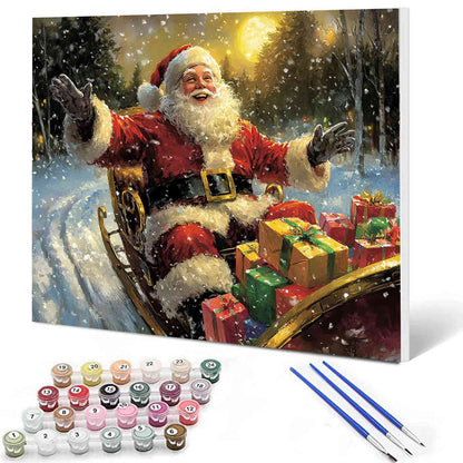 Ce kit de peinture par numéros de Noël présente un joyeux Père Noël s'élevant dans le ciel nocturne enneigé sur son traîneau. Les bras tendus en signe de bienvenue, le Père Noël est entouré d'une montagne de cadeaux joliment emballés. La scène est magnifiquement détaillée et sera un merveilleux ajout à votre décoration de vacances !
