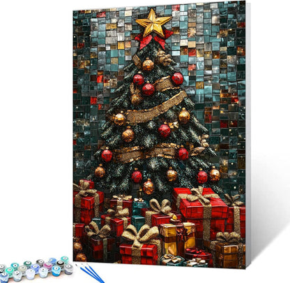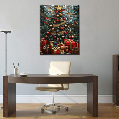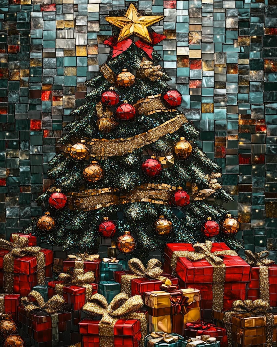 Sur un mur de mosaïque de carreaux émeraude, cuivre et bleu nuit, un majestueux sapin de Noël se dresse, ses branches enveloppées de rubans dorés scintillants et constellées de décorations rouges et dorées. En contrebas, un trésor de cadeaux aux riches tons rouges et métalliques se déploie, chaque boîte étant une véritable fête. Les textures chatoyantes et les reflets de pierres précieuses transforment cette scène festive en un chef-d'œuvre scintillant. Chaque coup de pinceau ajoute à la magie, apportant la chaleur des fêtes entre vos mains.