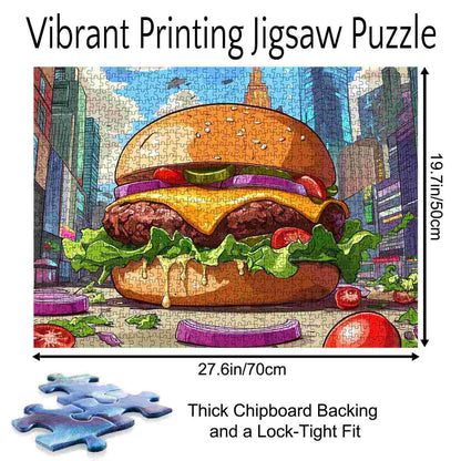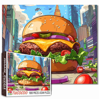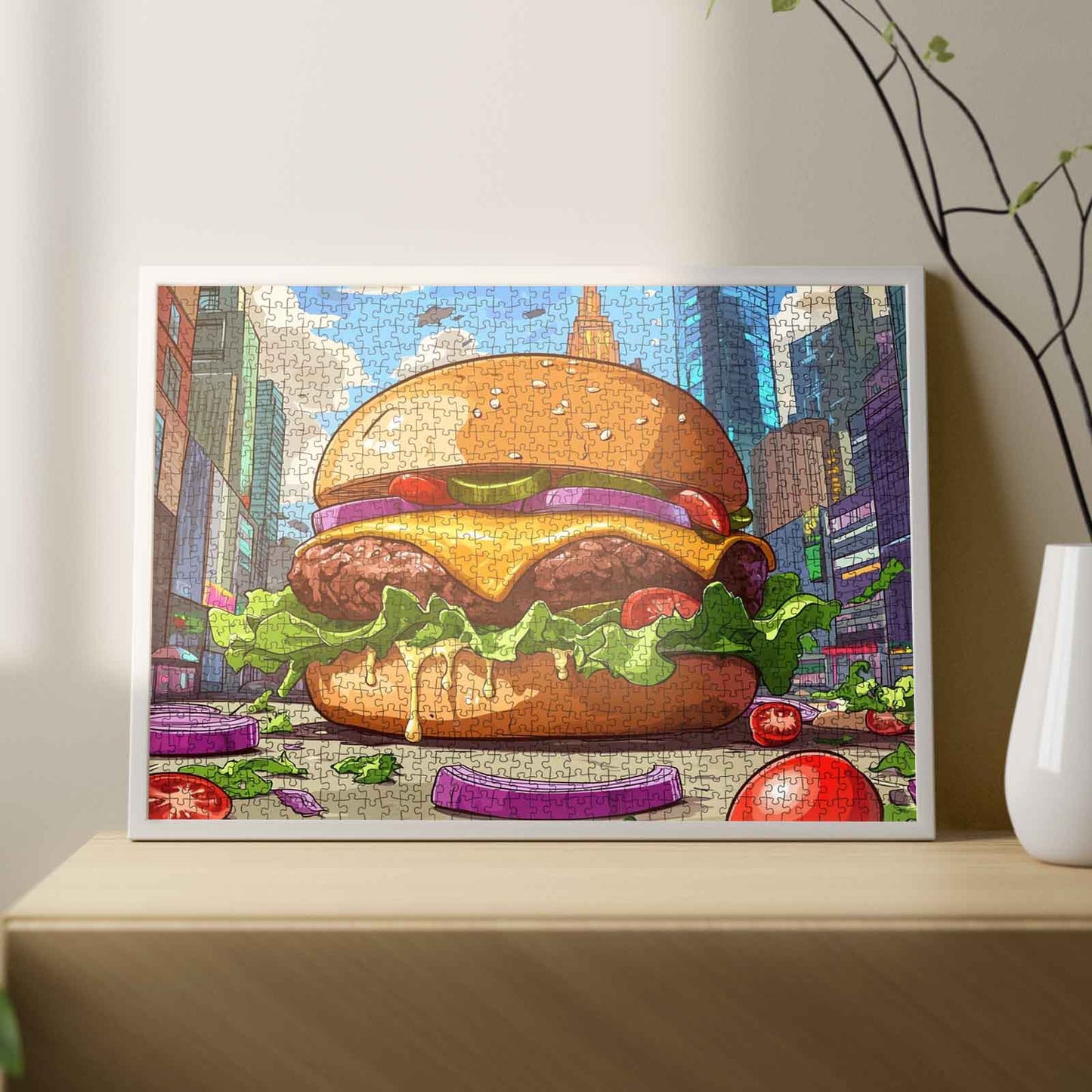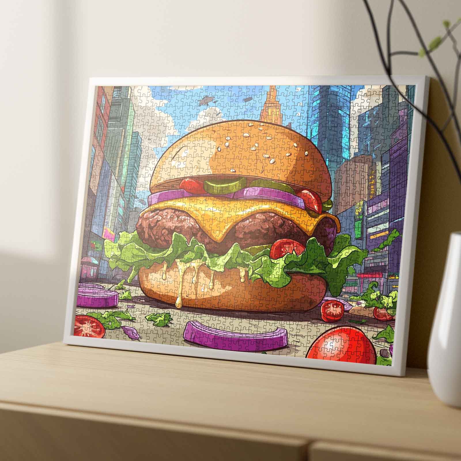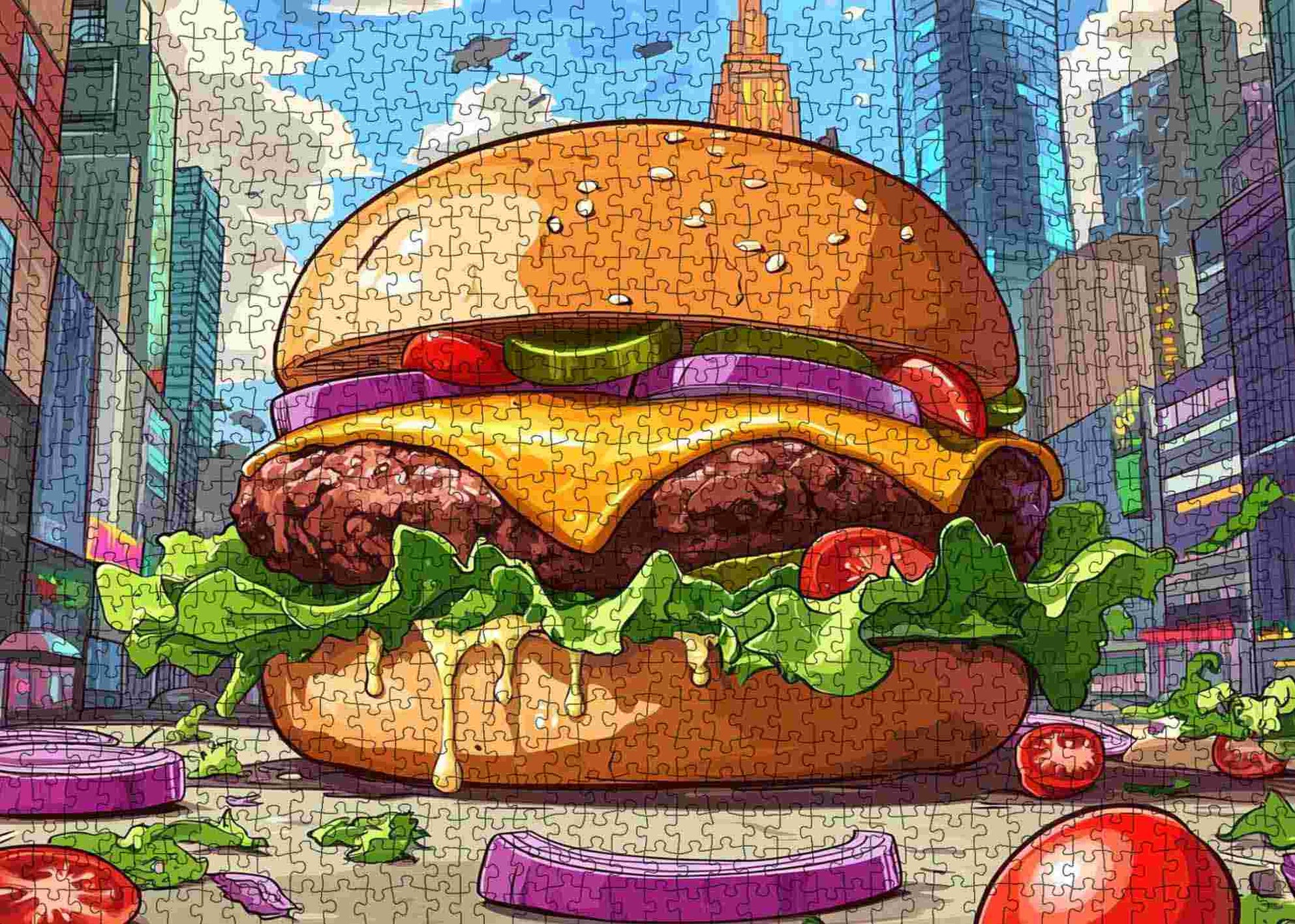 Au cœur d'un paysage urbain animé, un cheeseburger géant et juteux trône avec sa laitue croquante, ses tomates fraîches et son fromage fondant. Entouré de gratte-ciels et d'un ciel ensoleillé, ce décor ludique rend un délicieux hommage aux saveurs américaines classiques.