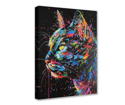 Cette superbe toile graffiti capture le profil majestueux d'un chat, peint dans une explosion de couleurs vives sur un fond noir. Les éclaboussures et les stries abstraites créent un mélange captivant d'énergie et d'élégance, faisant de cette œuvre d'art un point focal accrocheur pour n'importe quel espace. Parfaite pour les amoureux des chats et les fans d'art moderne, cette pièce rayonne de personnalité et d'élégance, ajoutant une touche unique et vivante à votre décor. Imaginez cette toile audacieuse sur votre mur, apportant de la couleur et une touche de mystère félin dans votre maison.