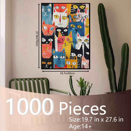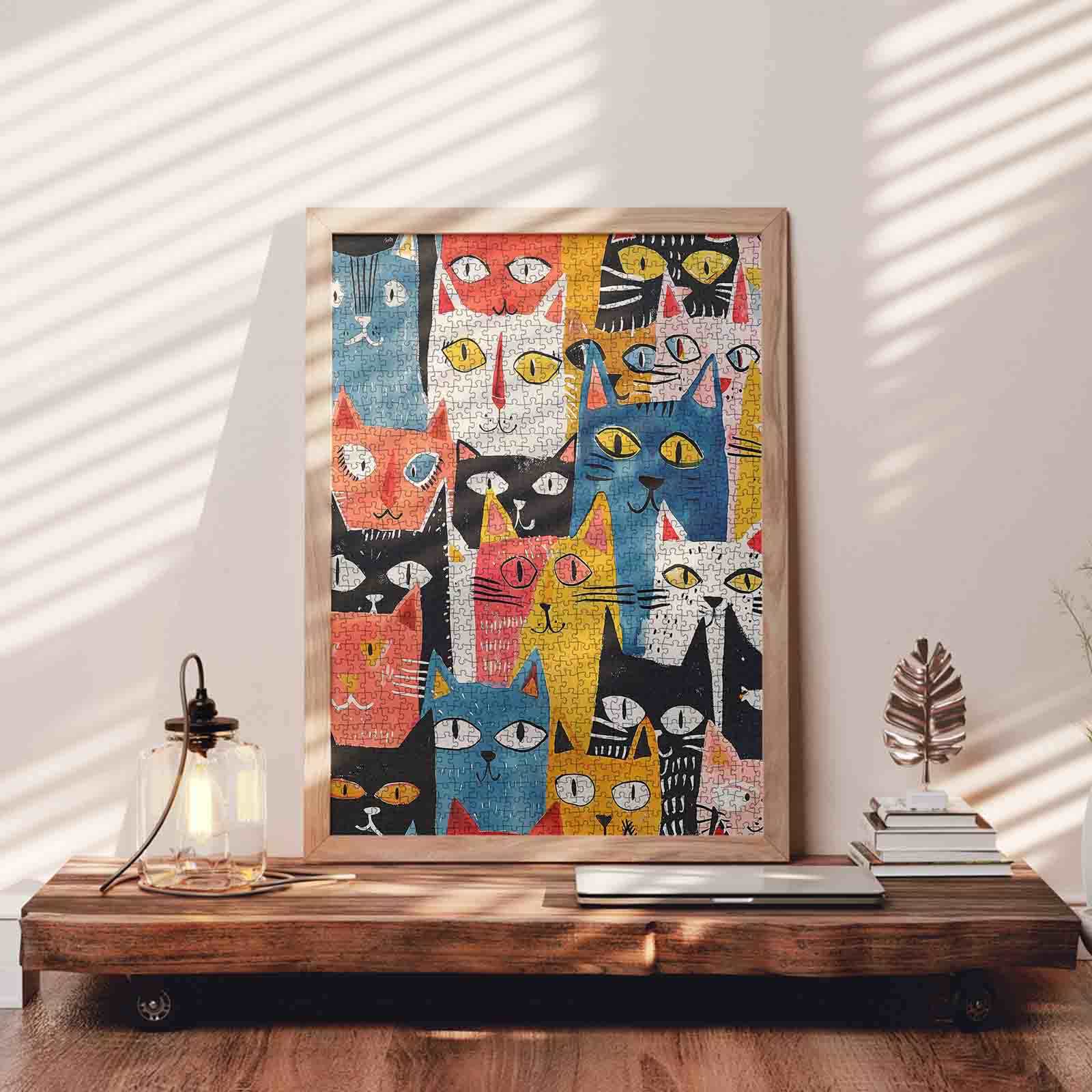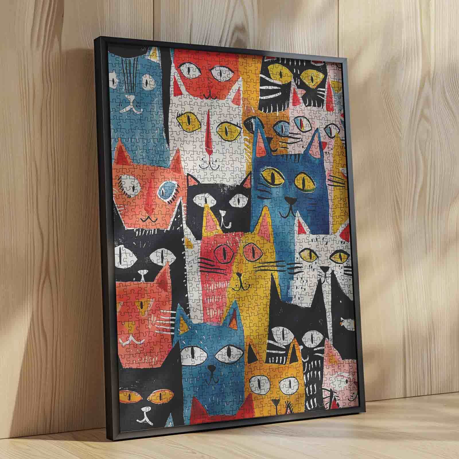 Une foule de chats excentriques aux yeux écarquillés, de toutes les couleurs imaginables, emplit la scène d'une énergie vibrante et d'une fantaisie débordante. Du jaune citron au bleu denim, leurs expressions abstraites et leurs regards décalés donnent à ce puzzle des allures de fresque murale moderne. Chaque félin semble avoir sa propre personnalité, apparaissant aux quatre coins du plateau, vous invitant à ralentir et à reconstituer une galerie de charme félin. Ce n'est pas qu'un simple puzzle : c'est une délicieuse explosion de couleurs, de malice et d'expressions qui se dévoile à chaque pièce posée.