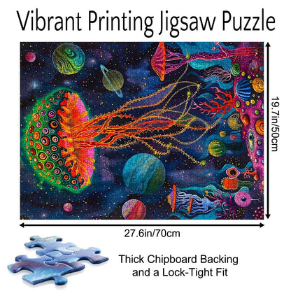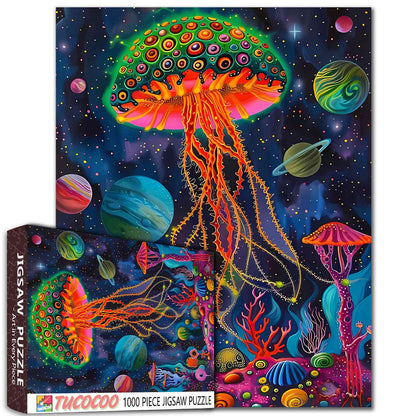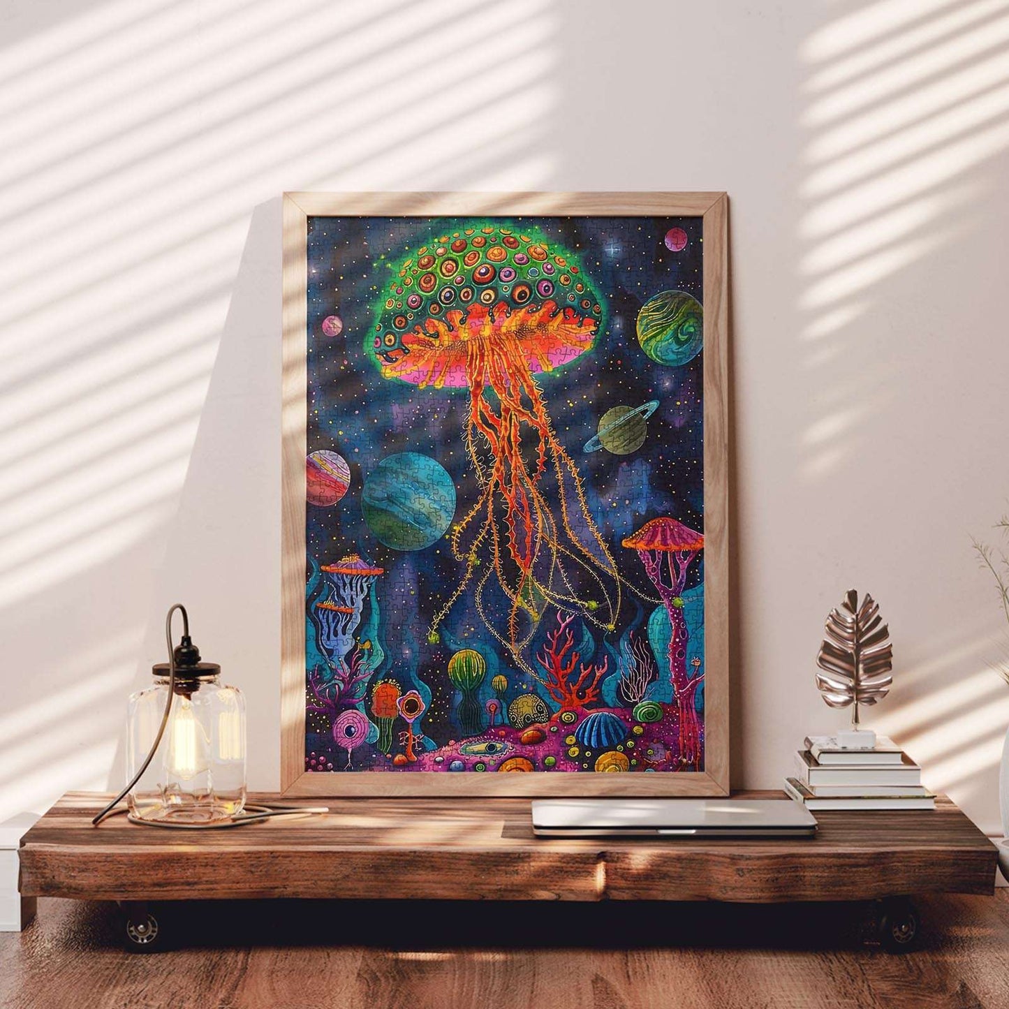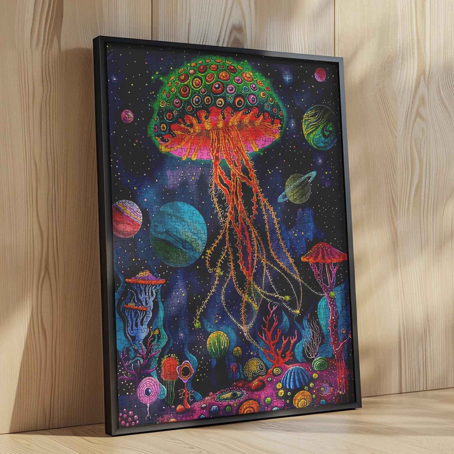 • Embarquez pour un voyage cosmique avec ce puzzle fascinant. Présentant une méduse vibrante et psychédélique flottant parmi les planètes et les étoiles, ce puzzle est parfait pour les adultes qui aiment l'art abstrait, l'espace et les couleurs vives.
