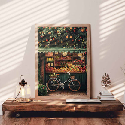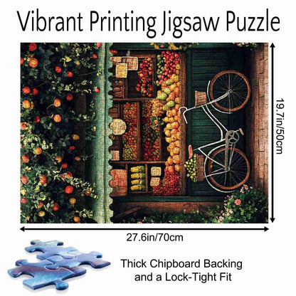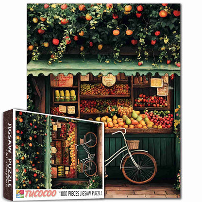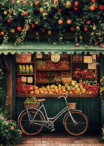 Sous un couvert de pommes et de fraises mûres, un étal de fruits chaleureux regorge des plus beaux cadeaux de la nature. Poires, citrons et baies soigneusement empilés brillent sous une lumière dorée, tandis qu'un vélo vintage repose tranquillement avec son panier rempli de poires vertes fraîches, prêt à une balade tranquille sur un chemin de campagne. L'étal en bois, les panneaux peints à la main et les vignes luxuriantes créent un charme intemporel. Chaque pièce de puzzle vous invite à une vie plus douce et plus simple, où chaque détail vous rappelle la maison. Parfait pour ceux qui apprécient la beauté rustique et les moments de paix.