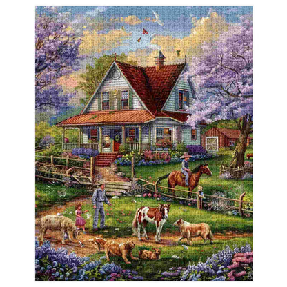 La lumière matinale baigne une charmante maison de campagne tandis qu'une famille commence sa journée, entourée de fleurs épanouies et d'animaux fidèles. Une petite fille suit son grand-père sur un chemin de terre, tandis que chevaux, chiens et moutons circulent librement dans le jardin animé. Sur le porche, une silhouette se balance doucement dans un fauteuil, savourant l'air frais du printemps. Des lilas encadrent la maison de douces fleurs violettes, et la grange en arrière-plan ajoute au charme paisible de la campagne. Chaque détail vous invite à un moment de sérénité et de chaleur.