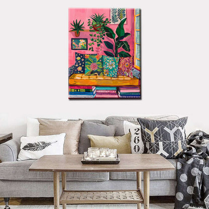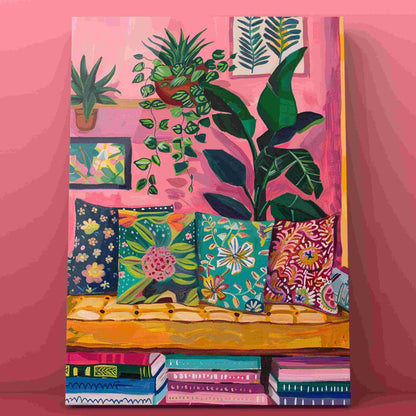 Donnez vie à une atmosphère chaleureuse avec cette peinture par numéros comprenant un charmant coin rempli de plantes vertes luxuriantes, de coussins floraux vibrants et de livres empilés. Le fond rose vif rehausse la chaleur et le confort de la scène, ce qui en fait un ajout délicieux à la collection de tout amateur d'art. Parfait pour la détente et la décoration intérieure.