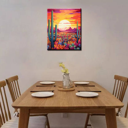 Plongez dans la beauté éclatante du désert avec ce kit de peinture par numéros, mettant en vedette des cactus imposants sous un ciel de coucher de soleil éclatant. Des oranges, des roses et des violets chaleureux remplissent le paysage, mettant en valeur les formes uniques des plantes du désert. Parfait pour les débutants et les artistes expérimentés, ce kit ajoute une ambiance colorée du sud-ouest à n'importe quel espace.