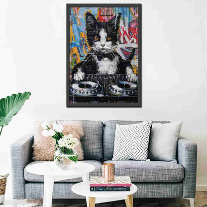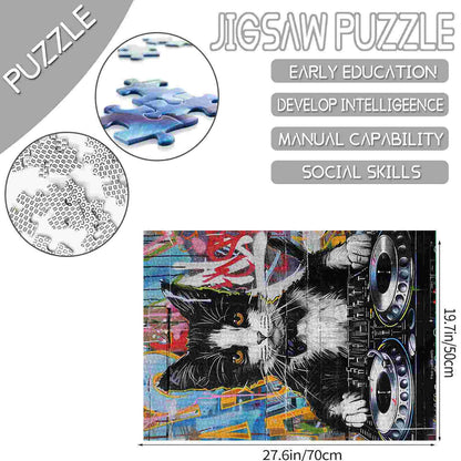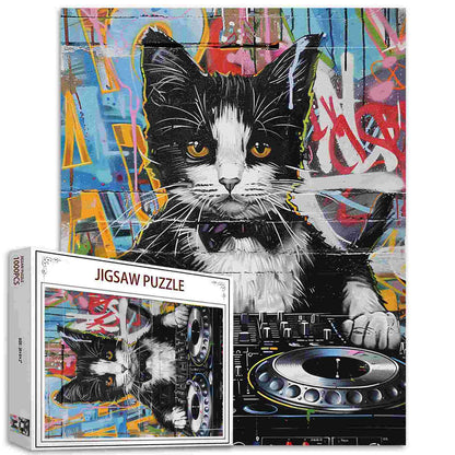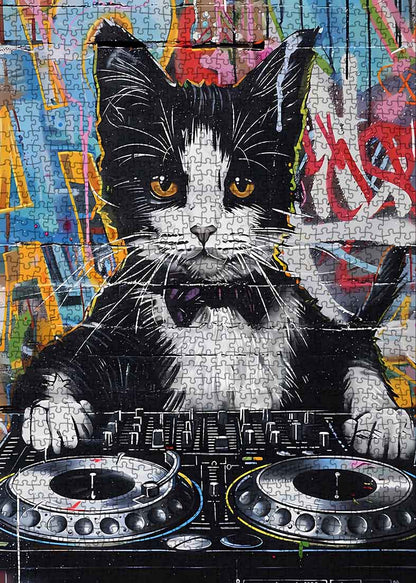 Un chat noir et blanc, élégamment vêtu d'un nœud papillon, se tient derrière une console de DJ, l'air concentré. L'arrière-plan est agrémenté de graffitis urbains aux tons rouge, bleu et jaune, mêlant street art et énergie de boîte de nuit. Les pattes posées avec assurance sur les platines, ce DJ félin est prêt à balancer le rythme. Mélange parfait de douceur et de fraîcheur, ce puzzle apporte rythme et caractère à votre table, pièce par pièce.