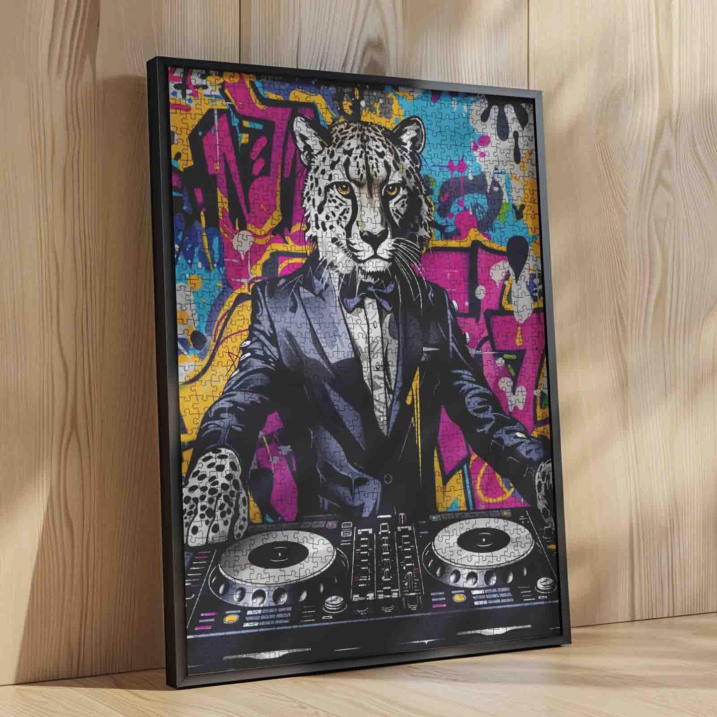 Sous les néons et les graffitis explosifs, un léopard en smoking tient les platines avec une aisance décontractée. Son regard intense et sa posture posée rayonnent de charisme tandis que la musique résonne dans les rues. Chaque pièce du puzzle construit cette scène urbaine survoltée, où street art et mode se rencontrent. Que vous soyez amateur de visuels audacieux ou de félins féroces, ce puzzle vous offre une expérience inoubliable, rythmée et colorée.