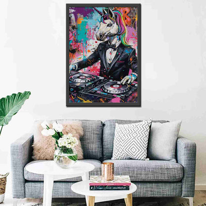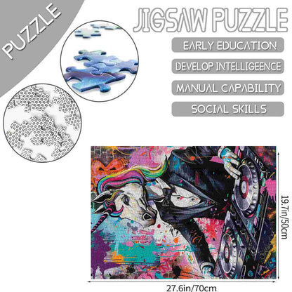 Au milieu d'une explosion de néons et de graffitis urbains, une licorne en smoking trône derrière la platine du DJ. Sa crinière arc-en-ciel luisant sous les lumières des graffitis, elle balance des beats aussi endiablés que son style. Le mélange de fantasy et de street art confère à cette scène une énergie surréaliste. Chaque pièce du puzzle vous plonge au cœur de ce moment rave fantastique, figé dans l'encre et la couleur.