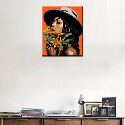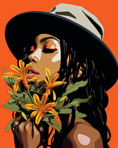 Cette œuvre captivante met en scène une femme noire confiante portant un chapeau élégant, tenant des lys orange vif sur un fond orange saisissant. Le contraste des fleurs douces avec son expression audacieuse crée un visuel puissant. Avec Paint by Numbers, donnez vie à ce superbe portrait, que vous soyez un débutant ou un artiste expérimenté.