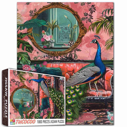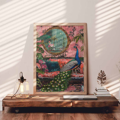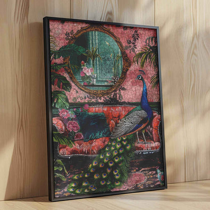 Un paon saisissant se perche gracieusement sur un canapé en velours moelleux, ses plumes irisées se déployant dans un spectacle éblouissant. Le fond rose intense et le miroir doré orné créent un décor opulent, mêlant grandeur naturelle et luxe vintage. Chaque pièce révèle la beauté complexe de cette composition époustouflante, vous invitant dans un univers d'élégance et de charme.