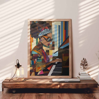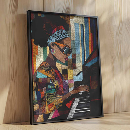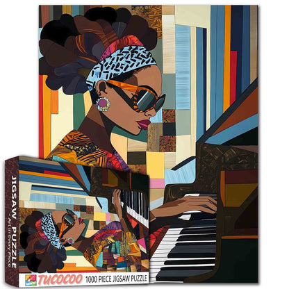 Ce puzzle représente une élégante femme afro-américaine assise à un piano à queue, plongée dans l'univers musical. L'œuvre est un superbe collage de couleurs et de motifs audacieux, créant une esthétique culturelle vibrante. Elle porte un élégant foulard, de grandes boucles d'oreilles et des lunettes de soleil chics, dégageant assurance et sophistication. Ce puzzle est non seulement un défi amusant, mais aussi une œuvre d'art unique, parfaite pour offrir ou décorer votre intérieur.
