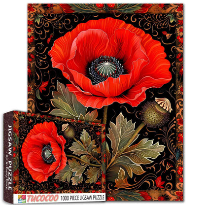 Célébrez la beauté intemporelle de la nature avec ce superbe puzzle de coquelicots rouges. Le motif floral complexe sur fond noir, mis en valeur par des accents dorés ornés, crée une pièce fascinante et élégante. Parfait pour les amateurs de puzzles et les amoureux de la nature, il apporte joie, détente et une touche de sophistication à votre temps libre.