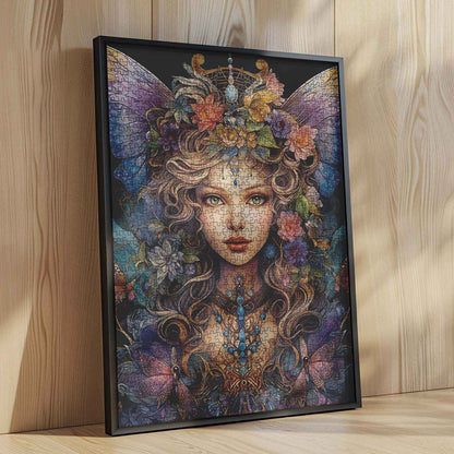 Plongez dans un monde de fantaisie avec notre puzzle Fée enchantée aux fleurs. Ce superbe puzzle de 1 000 pièces présente une fée mystique ornée d'une couronne complexe de fleurs et de bijoux étincelants, ses yeux expressifs vous invitant dans son royaume magique. Entourée d'une tapisserie luxuriante d'élégance florale, ses ailes détaillées et ses ornements vibrants donnent vie à chaque pièce, offrant une expérience de puzzle fascinante. Idéal pour les amateurs de mythe et de majesté, ce puzzle promet une aventure captivante dans l'artisanat et la beauté.