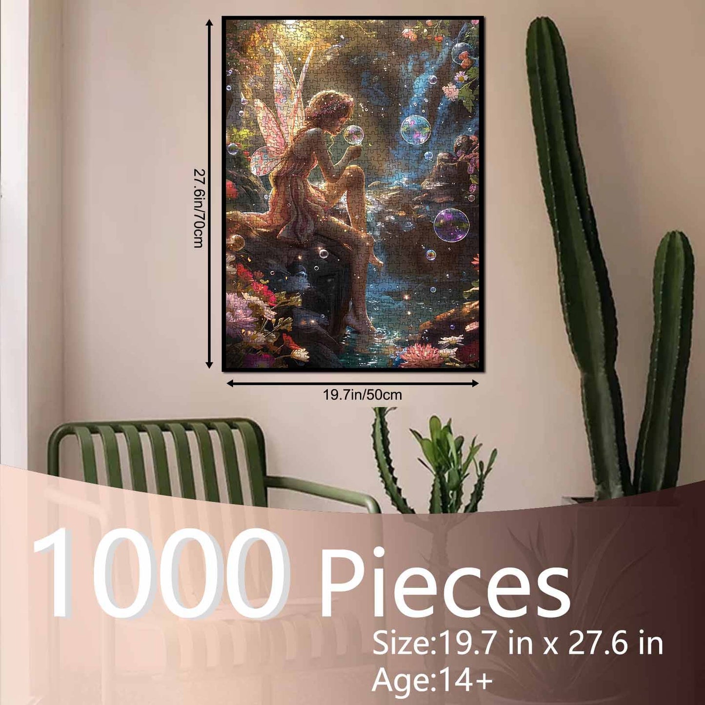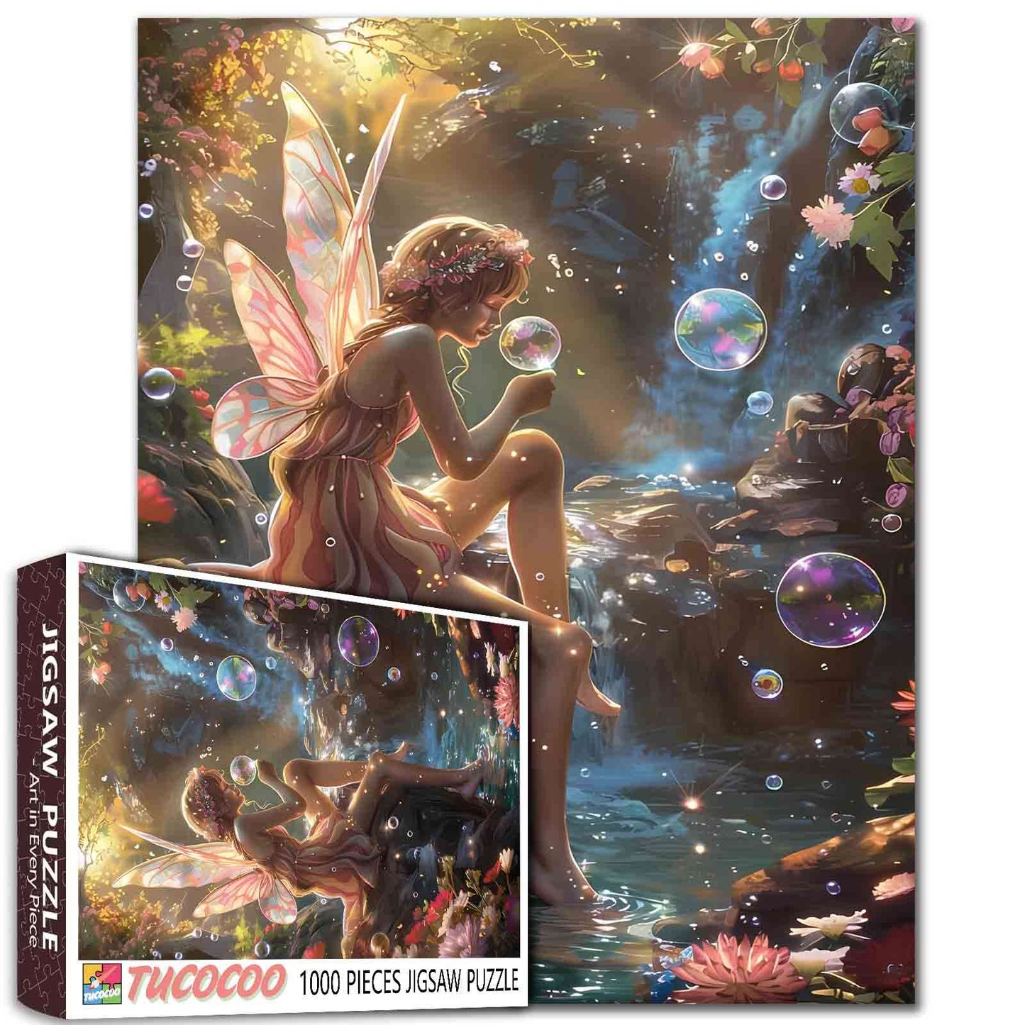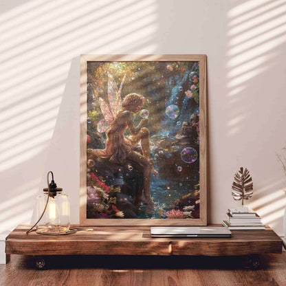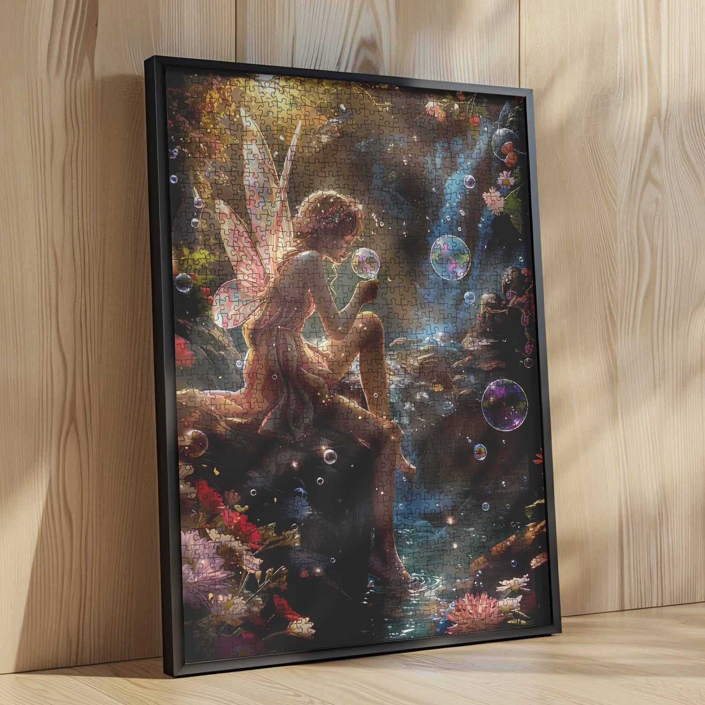 Baignée de lumière dorée, une fée délicate se perche près d'un ruisseau scintillant, fascinée par une bulle lumineuse dans sa main. La verdure luxuriante, les fleurs flottantes et les orbes lumineux qui l'entourent créent un paysage onirique paisible et magique. Ses ailes, douces et translucides, reflètent la lumière du soleil comme tissées de rosée matinale. L'instant est immobile, mais vibrant d'émerveillement – une invitation à la pause, à la réflexion et à la perte dans la beauté tranquille de l'enchantement de la nature. Compléter ce puzzle, c'est entrer dans un conte de fées paisible où fantaisie et calme se mêlent.